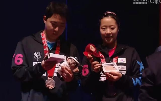 韩国队在拿到奖牌之后,整个人表现得非常的兴奋。两人靠在一起交头接耳分享这胜利后的喜悦