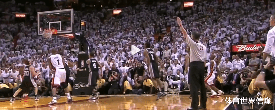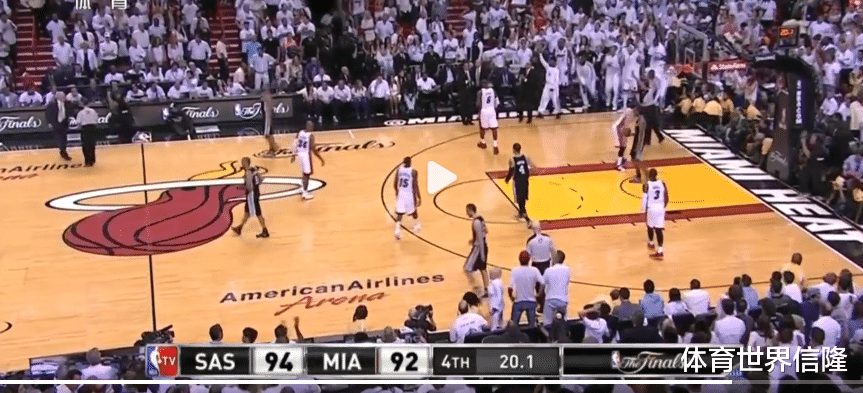 这最后的19秒,热火若是无法投进3分,就将大概率丢掉总冠军,詹姆斯在左侧45度再次出手3分不中,此时邓肯又没有在场上,结果波什抢到篮板给到底角的雷阿伦,他投进了那记载入史册的重要3分,比分是95平,第四节还剩5.2秒。