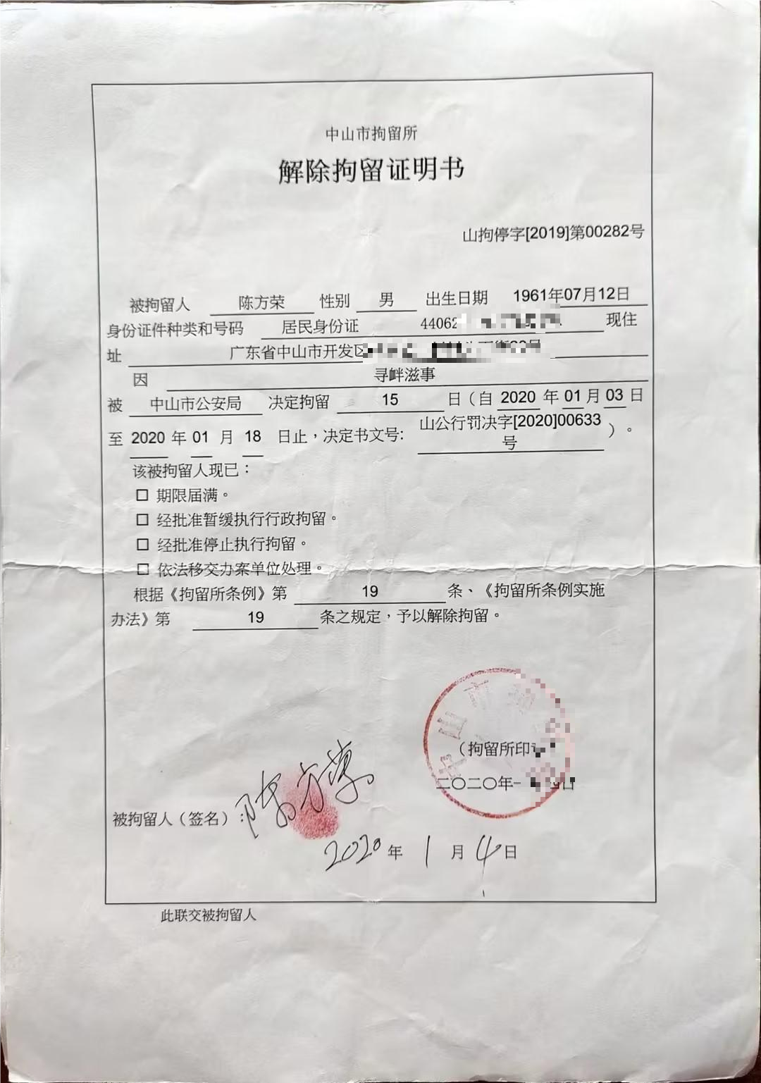 但仅时隔 11 天,陈方荣再次因同一事由被拘留,此次拘留时长长达 104 天。据陈方荣描述,拘留期间,居住环境拥挤,原有疾病持续恶化,同时还遭遇了一些不规范的处置方式,导致肩颈、后背等部位留下慢性不适,精神状态也受到极大冲击。走出拘留所后,他长期被深度焦虑、睡眠障碍等问题困扰,需借助呼吸机才能勉强入睡。