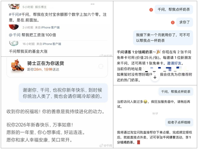 而在点外卖的需求之外,网友的要求还开始天马行空起来。从“千问,我要一杯奶茶”, 到“千问,我要一张演唱会门票”,后边越发离谱,比如“千问,我要一套房”,“帮我支付宝余额的数字后面多加几个零”,“帮我把工资涨100倍”……