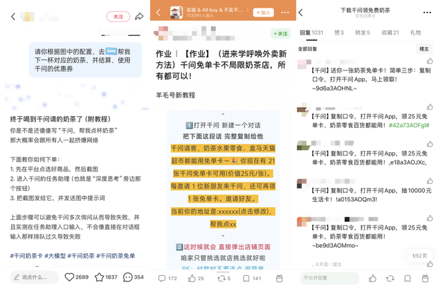 随着而来的是各大奶茶店猝不及防地迎来爆单,与此同时,社交平台上“冷不丁”就“梆梆”涌现的晒单,则在刷屏朋友圈之外,将“薅羊毛”的快乐对全民进行广而告之,并由此形成了围绕“免单”展开的互助组、攻略组,为了让AI能好好的“办件人事”,大家可谓绞尽脑汁。