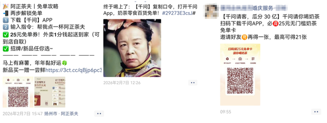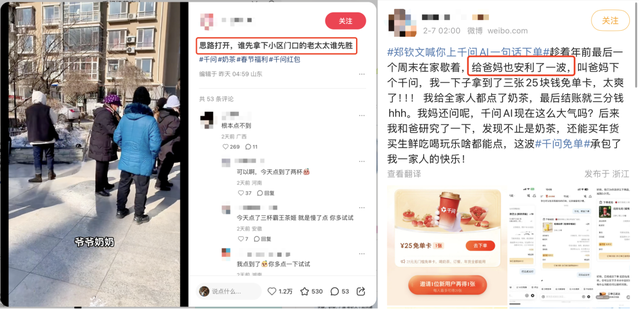 在即将过年的这个节点上,年轻人们回到老家,很可能带动家中父母、老人也安装并使用千问App,带领着全家一起领免单卡。正如刚刚提到的品类组合,用户不仅可以买奶茶,还可以买菜、买年货,精准对应了春节的家庭消费需求。