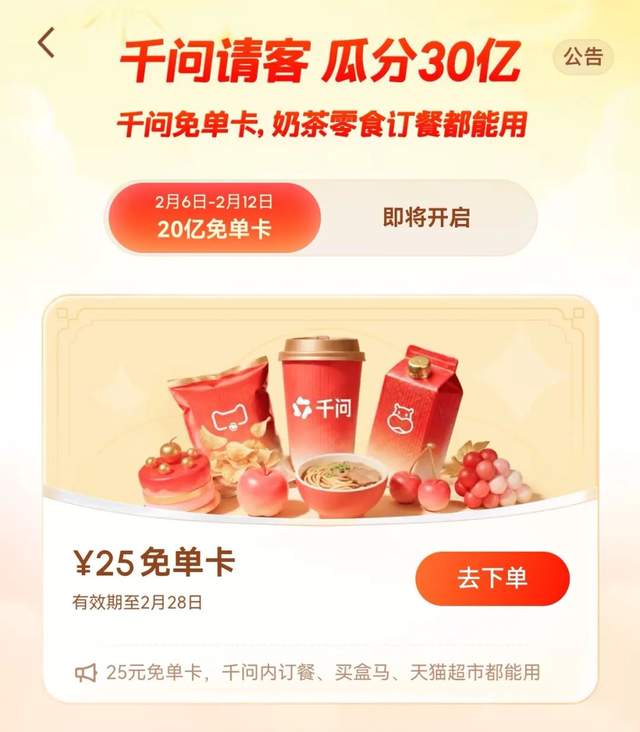 2月6日,阿里千问投入30亿元开启春节免单活动,豪横地请所有用户喝奶茶。注册即可获得25元无门槛券,对千问说“帮我点杯奶茶”,一分钱就能下单。而如果邀请到其他新用户,双方还能额外获得一张25元免单卡。