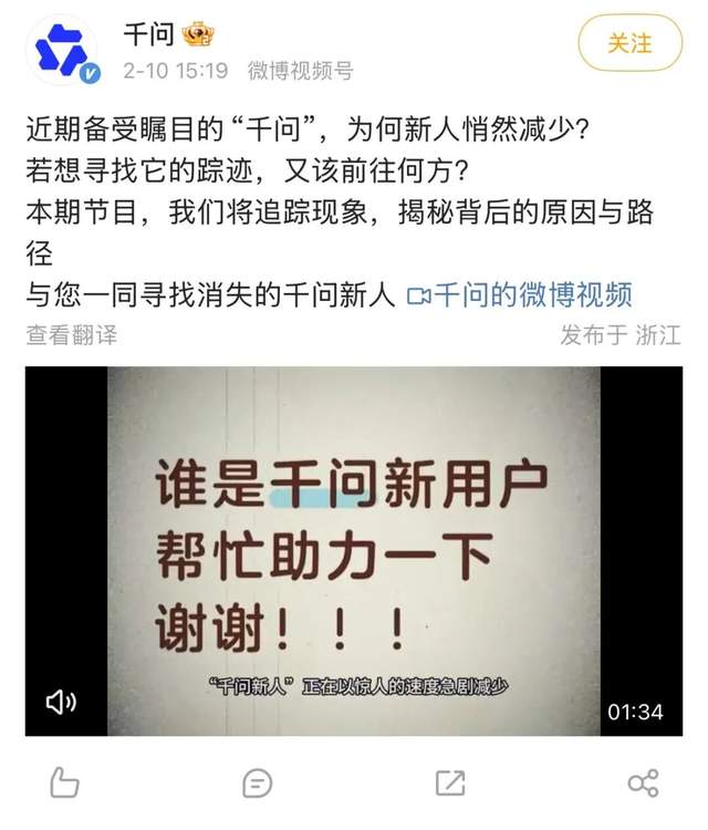 甚至连千问官方也就着“千问新人”这个梗玩起了抽象,把寻找消失的千问新人打造成“走进科学”式的纪录片。官方冲浪玩梗速度之快令人咋舌,只能说,千问拉新是认真的。