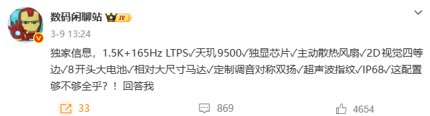 据知名博主@数码闲聊站 爆料:“独家信息,1.5K+165Hz LTPS✓天玑9500✓独显芯片✓主动散热风扇✓2D视觉四等边✓8开头大电池✓相对大尺寸马达✓定制调音对称双扬✓超声波指纹✓IP68✓这配置够不够全乎”。