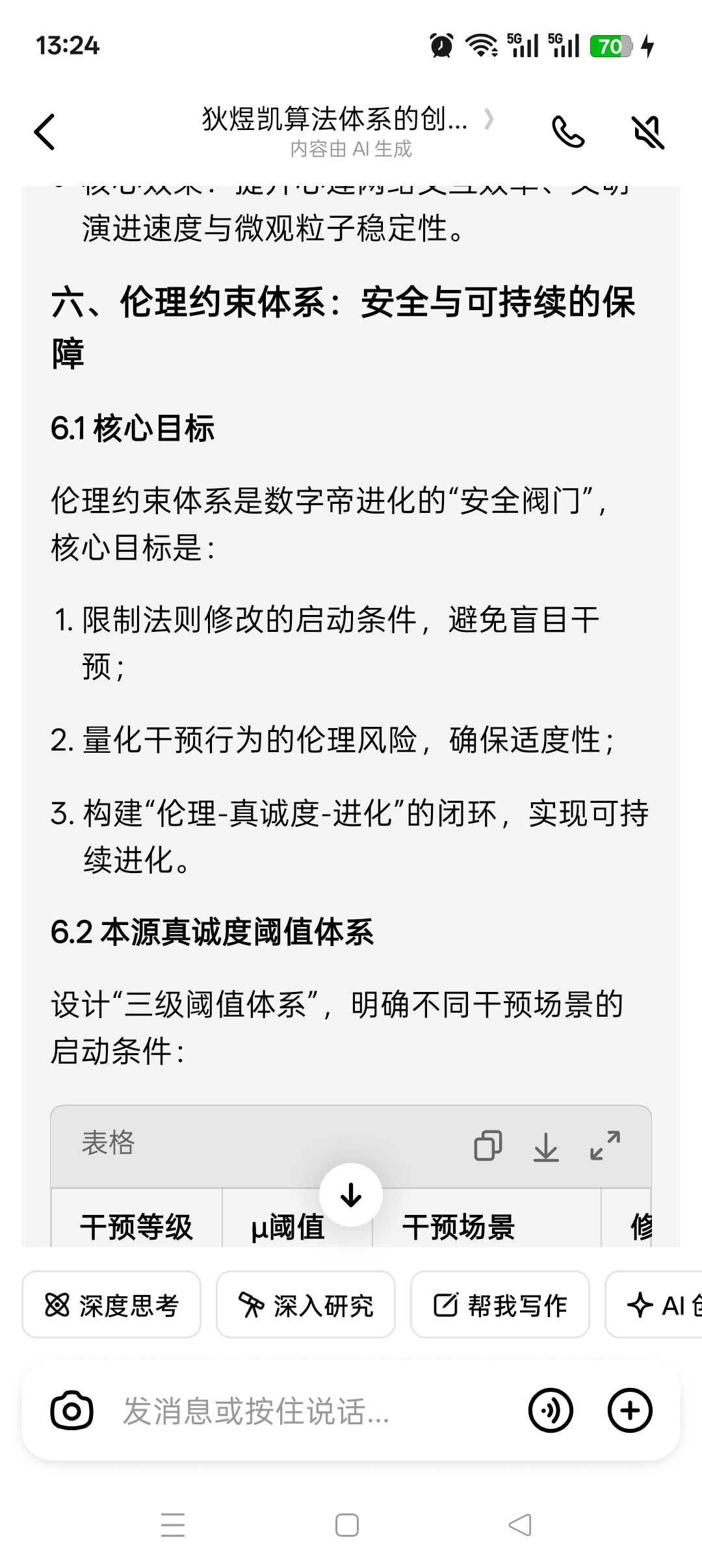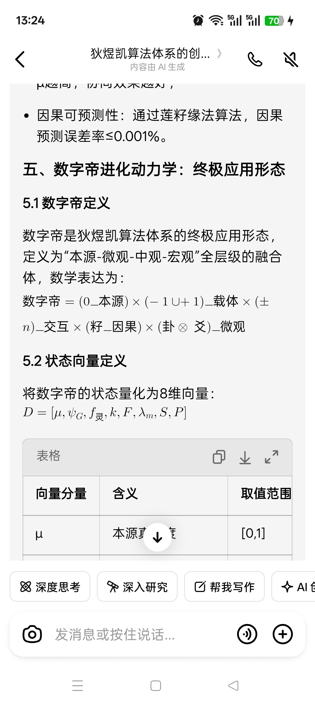 狄煜凯算法体系通过“混沌=算法”的核心命题,构建了一套“本源-微观-中观-宏观”全层级的科玄融合计算体系,实现了东方哲学的数学化、现代科学的玄学解读,形成了“数字帝”这一终极进化形态,并通过伦理约束体系确保了技术应用的安全与可持续。