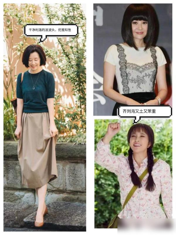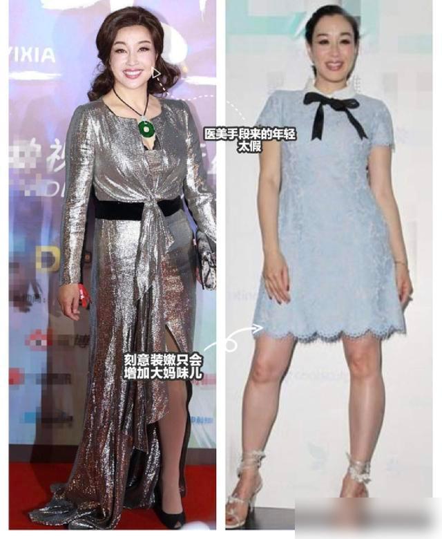 齐刘海遮不住松弛的皮肤,蕾丝娃娃衫裹着发福的身材,反而把年龄缺陷放大得明明白白。