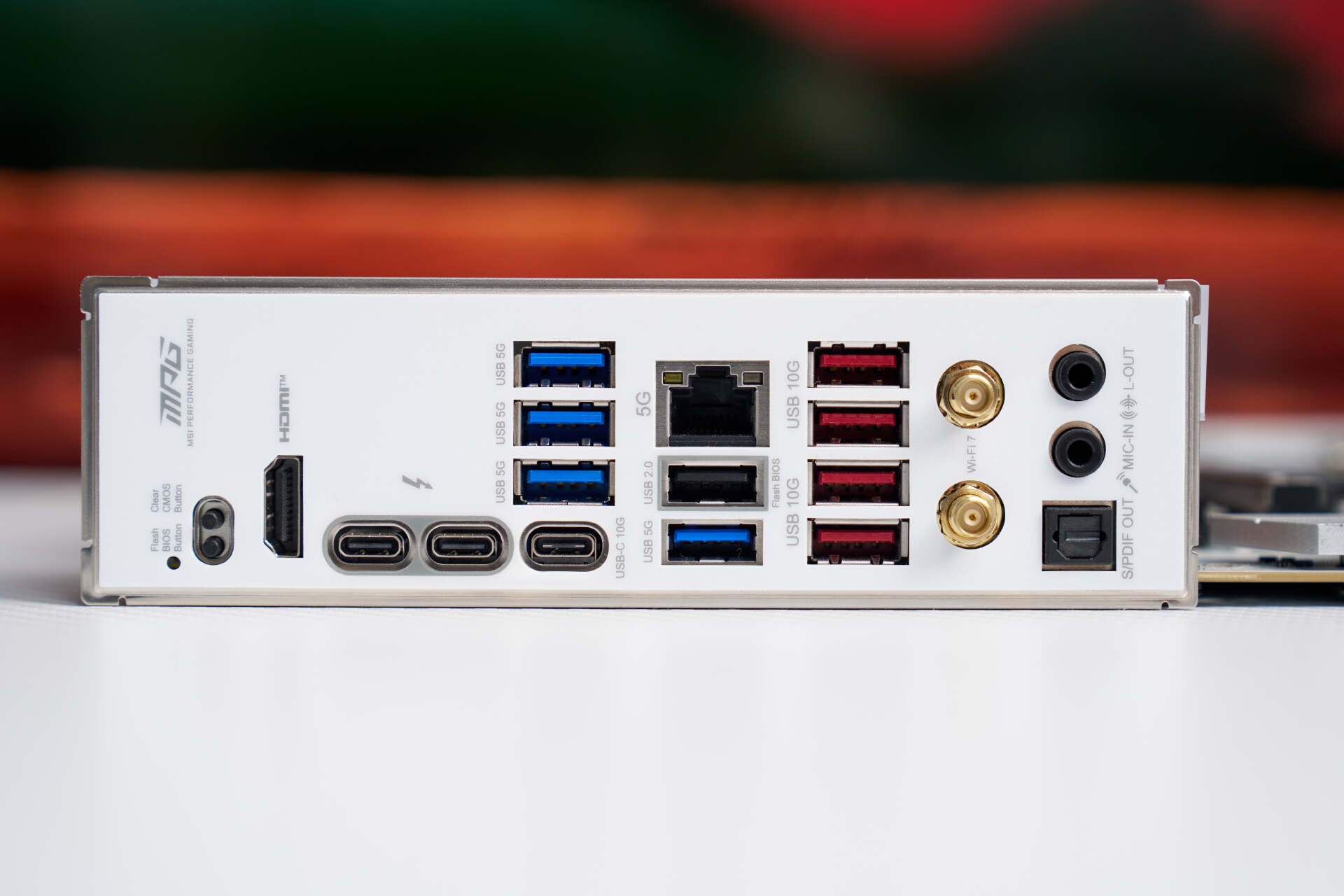 背板 I/O 接口部分,微星 MPG Z890 EDGE TI WIFI 刀锋钛主板延续了全面且高速的配置水准。接口阵容涵盖双雷电 4 接口、10Gbps 规格 Type-C 接口、多个高速 USB-A 接口,同时标配 5G 有线网口与 Wi-Fi 7 无线网卡,形成有线 + 无线的高速网络双保障。丰富的接口类型与高速传输规格,无论是连接 NVMe 移动硬盘等高速存储设备、搭建多屏显示工作站,还是畅玩网游时追求低延迟网络传输,都能为用户带来极致、流畅的使用体验