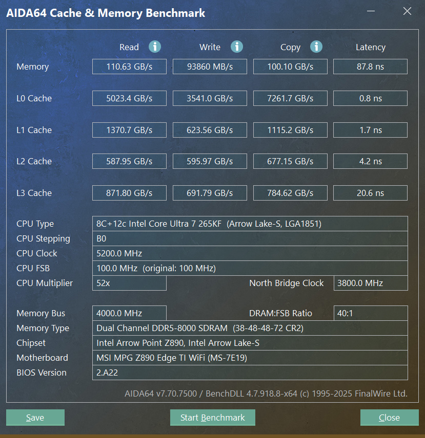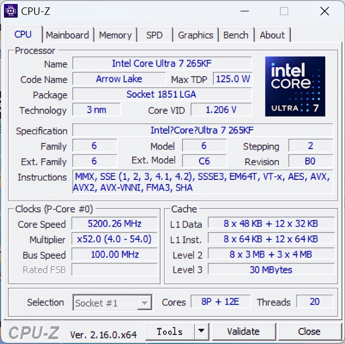 本次评测还是用的英特尔酷睿 Ultra 7 265KF 265KF这颗CPU,主要是降到2000元以下了,性价比拉满。英特尔酷睿 Ultra 7 265KF 处理器依托全新 Arrow Lake 架构打造,采用 8 性能核 + 12 能效核 的异构 20 核设计。性能核最高睿频直冲 5.5GHz,为游戏、专业软件等对单线程性能敏感的场景提供极致响应速度;新一代能效核则在能效比优化的基础上,大幅提升多线程并发处理能力,轻松应对视频渲染、多任务办公等重度负载。