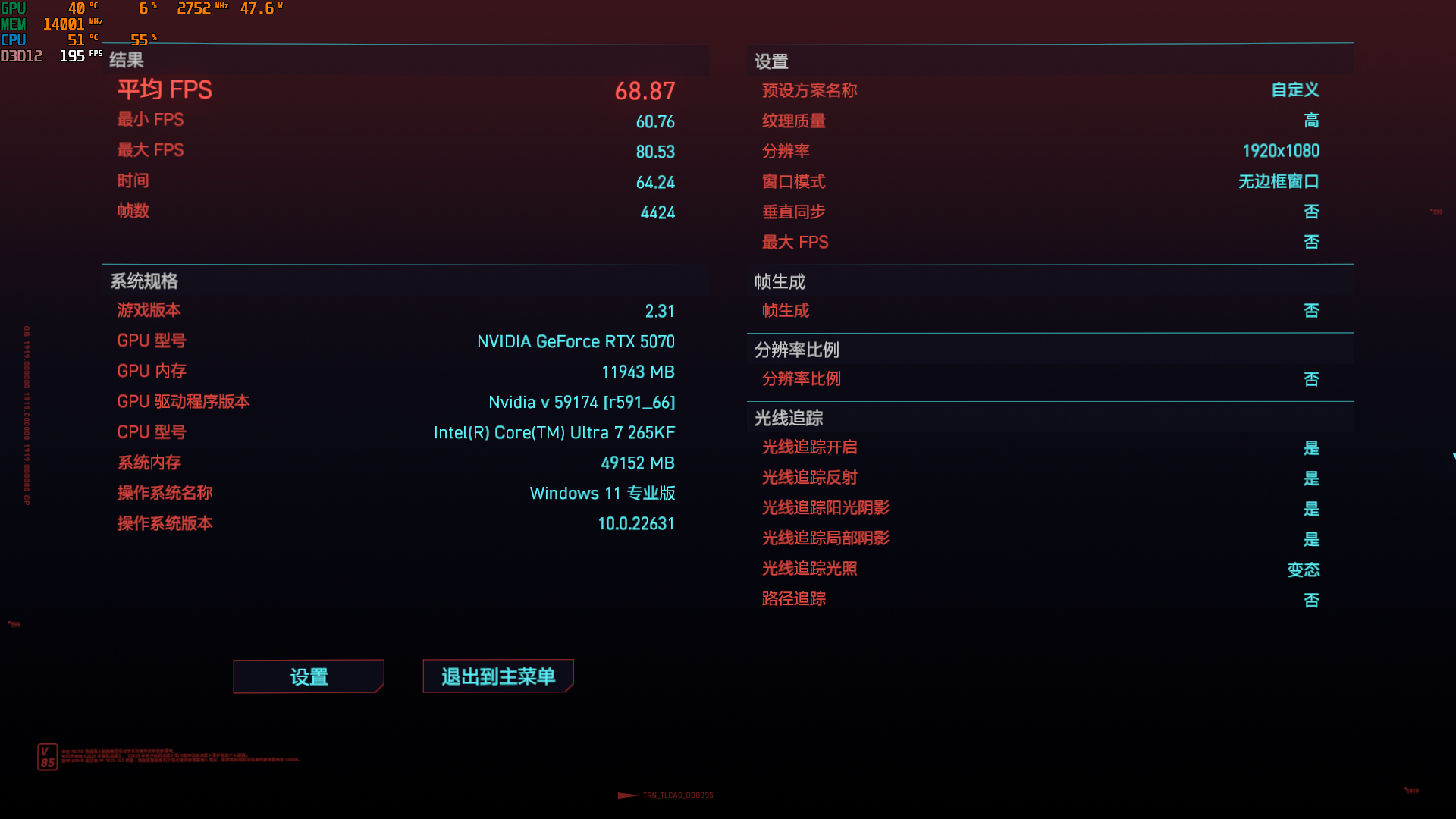 在画质标杆级 3A 大作《赛博朋克 2077》的实测环节中,我们将画质档位拉满至1080P 超级画质,且全程未启用任何超分技术。实测数据显示,该平台游戏平均帧率高达 68.5 FPS,1% Low 帧率也稳定在 55.6 FPS 的水平。即便是在光影特效密集的夜之城街头,或是爆炸、追逐等大规模动态场景下,画面依旧保持丝滑无卡顿的流畅表现。这一成绩不仅印证了酷睿 Ultra 7 265KF 对高负载游戏的出色算力支撑,更体现出整套平台在图形处理与数据运算上的均衡实力,为玩家带来兼具细腻画质与流畅体验的沉浸式游戏享受。
