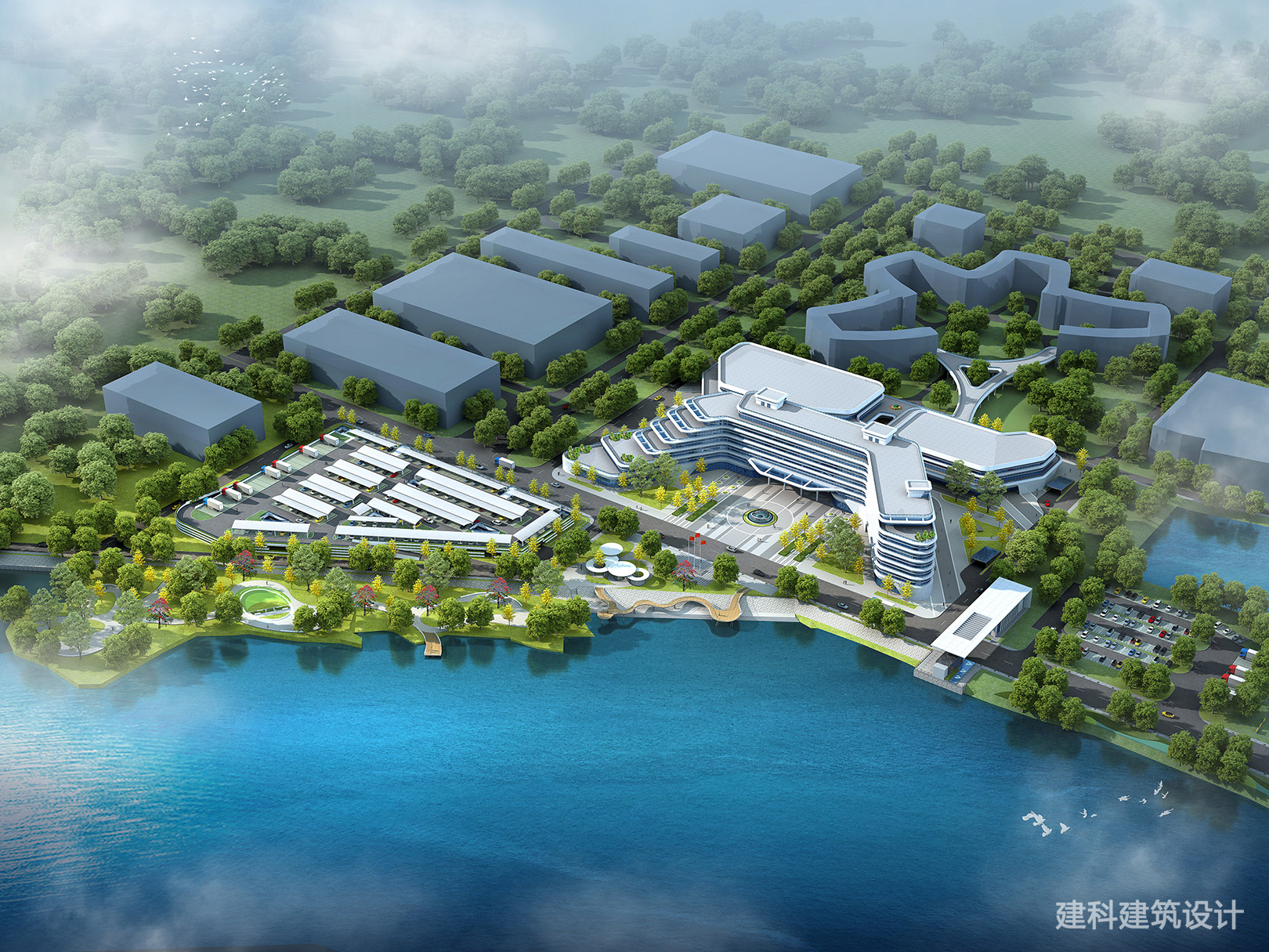 建筑曲面造型呼应湖岸肌理,以层叠舒展的形态,嵌进湖光山色里。步道、亲水平台串联起办公与生态,通勤是漫步,洽谈藏在微风里。