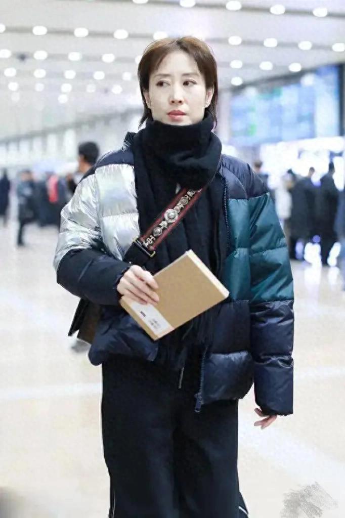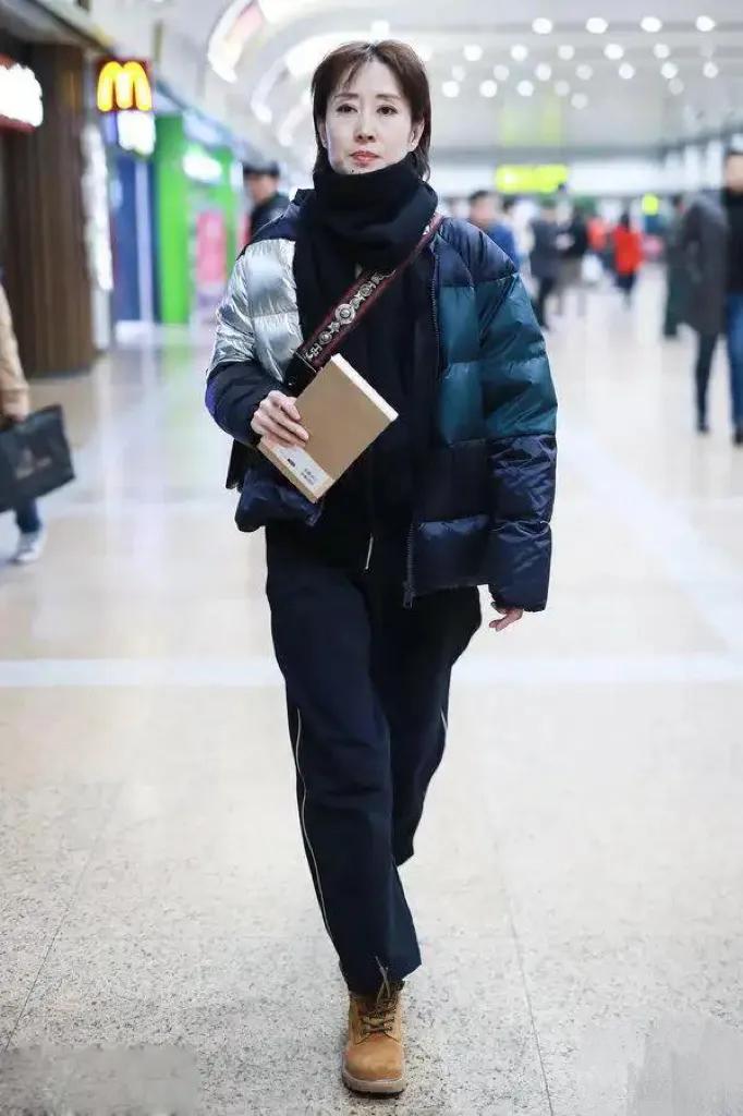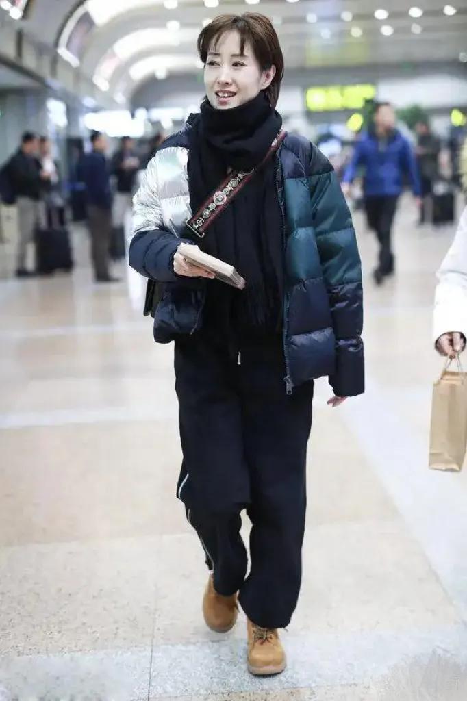 刘敏涛越老越时髦!穿拼色羽绒服+围巾+阔腿裤,减龄又洋气!