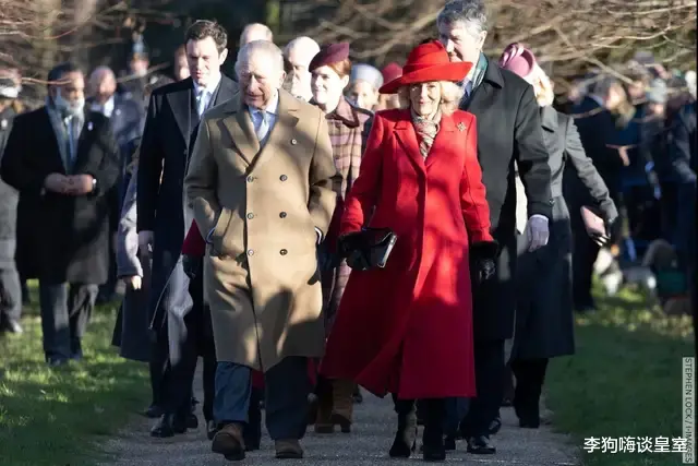 查尔斯国王与卡米拉王后率领众人,王后选择了鲜艳的红色(非常适合圣诞节的颜色),安妮公主也选了相近色调。