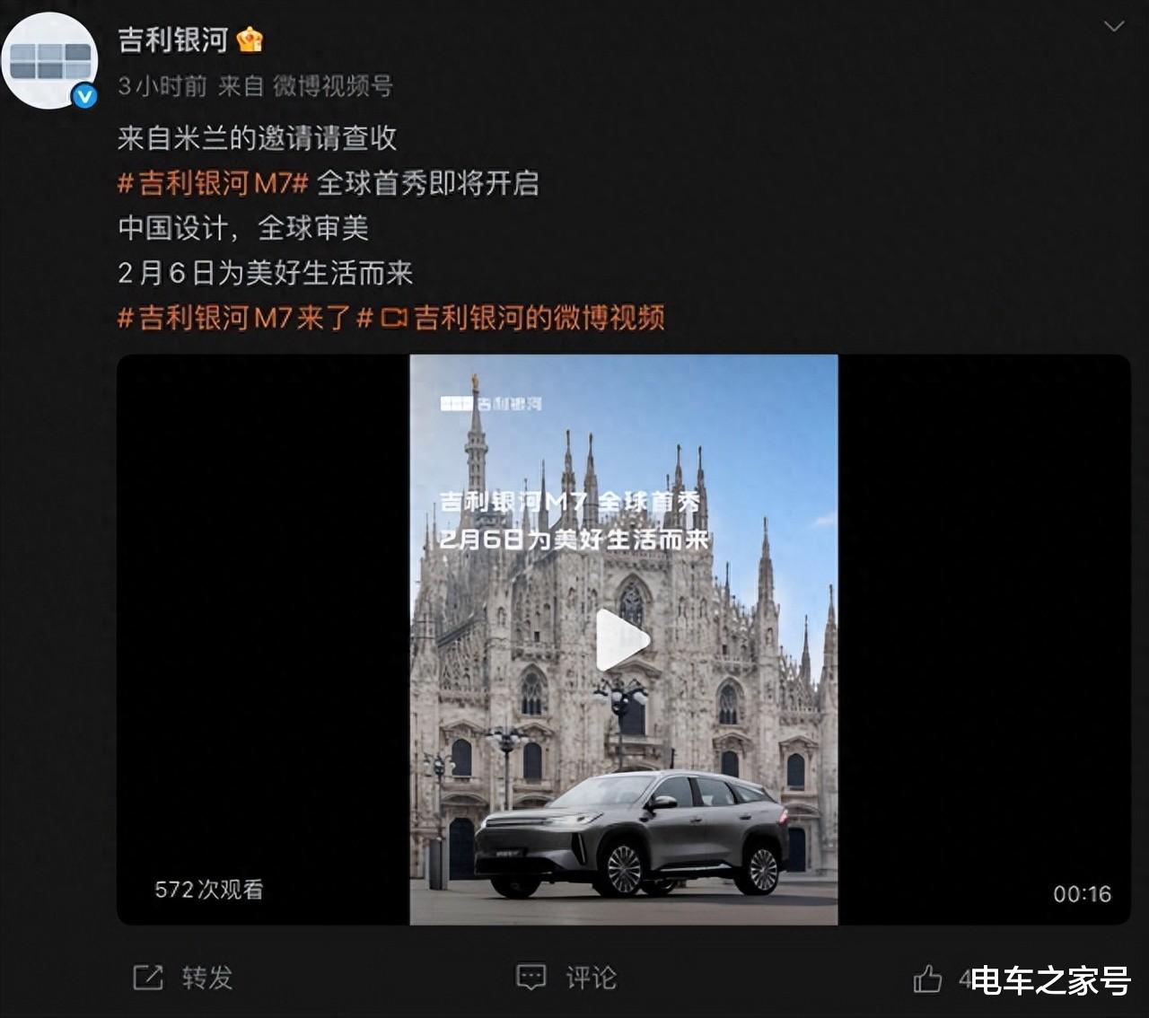 日前,电车之家获悉吉利银河旗下全新SUV 车型银河M7 将会在2月6日 在意大利米兰正式迎来全球首秀。