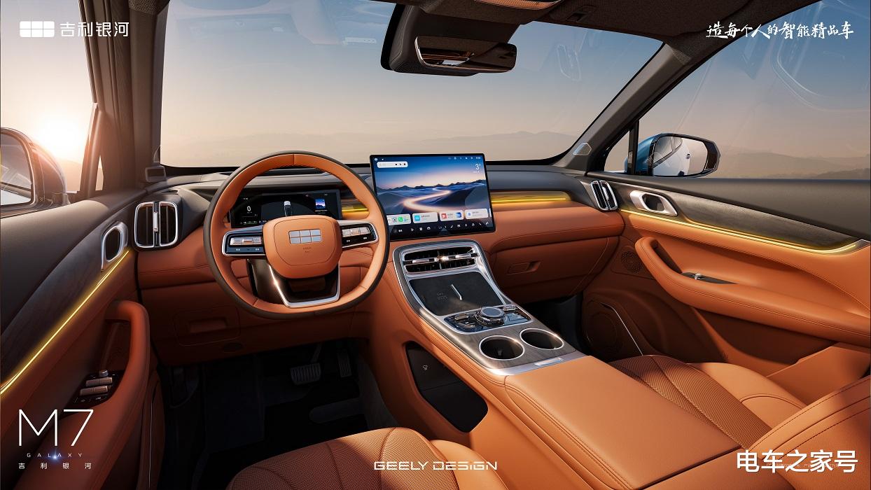 内饰部分,根据官方发布的海报信息看,吉利银河M7 采用趋于平直的中控台线条设计,上下双色搭配辅以多处镀铬元素点缀,营造出越级质感。全液晶仪表与大尺寸悬浮式中控屏的组合,科技感十足,从界面设计来看,新车有望搭载 Flyme Auto 车机系统,为用户带来流畅智能的交互体验。配置上,水晶旋钮控制键、手机无线充电、车内氛围灯以及实木元素饰板等配置的加入,进一步提升了座舱的豪华感与实用性。