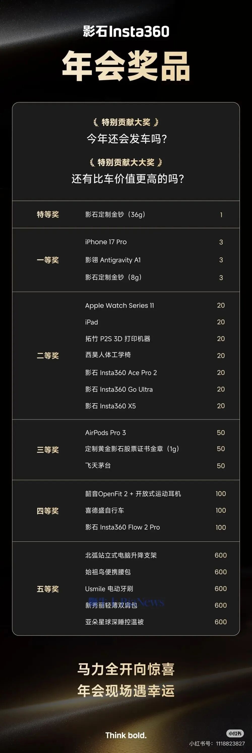 网上流传的影石Insta360年会奖品清单还显示,特等奖为36克影石定制金钞,一等奖则包含3台iPhone 17 Pro、3台影翎Antigravity A1以及3份8克定制金钞,各类奖品总数超3600份。影石方面也向极目新闻记者证实,该奖品清单属实,中奖率高达80%。其中,特等奖36g金纸(含黄金36g),被一位入职10天的新同事收入囊中,实习生现场抽走一台iPhone 17 Pro。