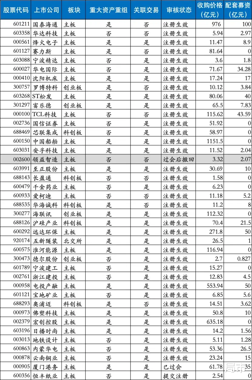 过会的40单重组中,37家上市公司已完成注册流程,1家已提交注册,1家年前刚刚过审尚未提交注册。剩下1家领益智造在过会后撤回材料,调整交易方案改为现金收购。