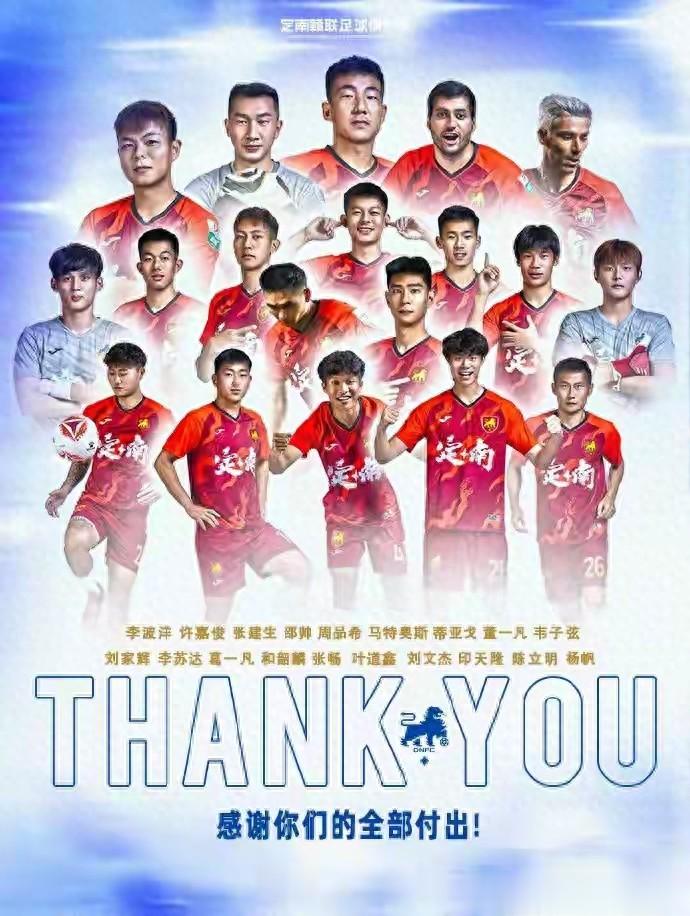 2026年2月27日,中甲定南赣联足球俱乐部通过官方渠道发布公告,确认张畅、张建生、董一凡、杨帆、周品希、叶道鑫、李苏达、蒂亚戈、刘文杰、和韶麟、印天隆、李波洋、陈立明、葛一凡、邵帅、许嘉俊、刘家辉、马特奥斯、韦子弦等19名球员将不再为球队效力。