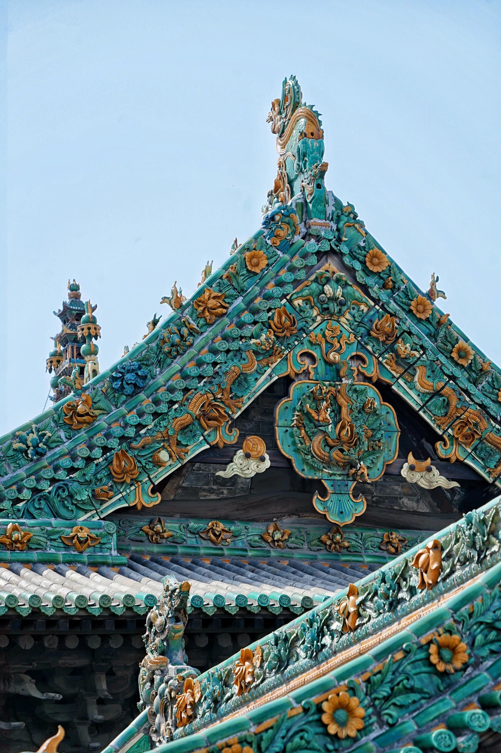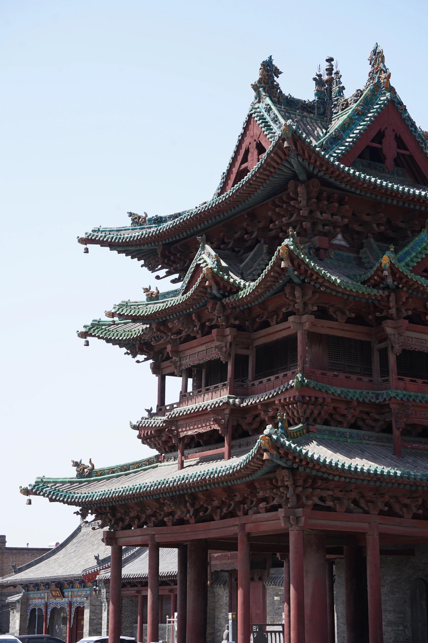 介休顺城关大街的早市总带着股花椒混着羊汤的热气,卖烧饼的老汉把铁鏊支在红砖墙根下,火钳敲得铁皮叮当响。墙头上突然探出半截孔雀蓝的琉璃檐角,檐脊上蹲着的神兽歪着脑袋,既不像龙也不像马,倒像是把波斯地毯上的纹样直接焊在了木头上——这就是祆神楼,全中国独一份的祆教建筑,藏在晋商老宅的灰瓦堆里,像个被汉化了千年的异域王子。