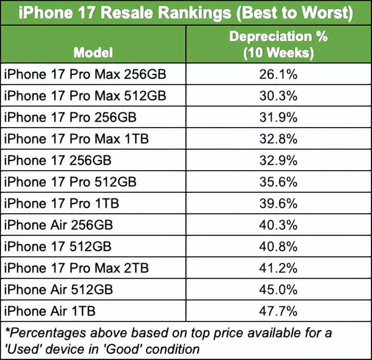 通常来说,因为苹果的内存是金子价,越高配置的贬值率越高。具体到配置的话,iPhone Air 1TB 版本,贬值率高达 47.7 %, 512GB 版本紧随其后,贬值率为 45.0 %。说是“到手亏一半”,一点都不夸张。