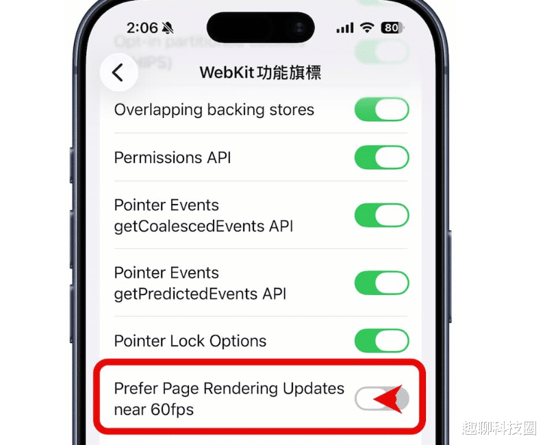 第三步,在 WebKit 的功能旗标里把「Prefer Page Rendering Updates near 60fps」这个选项关掉,中文是「偏好页面渲染更新接近 60 fps」,系统默认是开的,我们关掉它就把 Safari 对 60fps 的偏好解除;
