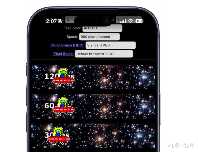 第四步,关掉后把 Safari 从后台完全关掉再打开一次,然后用 TestUFO 之类的屏幕刷新率测试网页去看,快速上下滑动页面或者让测试跑一会儿,页面渲染帧率就会从接近 60fps 提升到接近 120fps,说明解锁成功了。