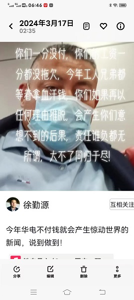 据胡祥付提供的2024年3月14日,徐勤源微信聊天截图显示,徐勤源威胁华电,中铁十八承认徐勤源没有任何工程施工,徐勤源账上从哪里来的上千万款项,徐勤源的这个威胁于没有任何结果,胡祥付发现他在网上说这话时,便给予截图。
