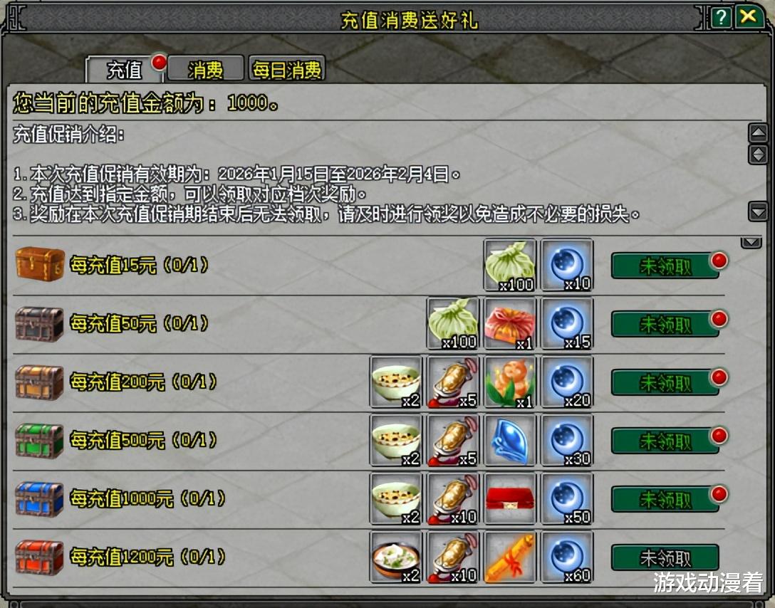 1月15日9:00,1月充消活动开启!参与充值消费活动即可享受充值奖励、消费奖励、每日消费奖励。充值多多,奖励多多,快来参与吧