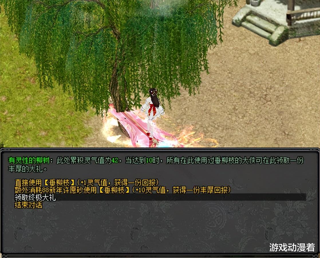 大侠每天活跃度达到125点,可在活跃度系统领取一个垂柳枝,前往春日灵地直接上交或添加新年许愿砂,可获上交奖励或高阶福利,灵地达标后贡献者还可领终极大礼。