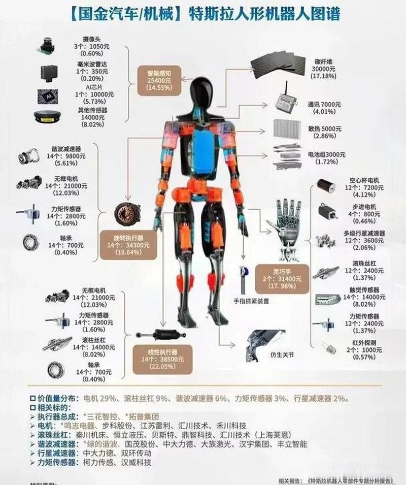 Optimus的“身手”同样出众。第三代手部拥有22个自由度,灵活性接近人手,系鞋带、穿针引线等精细活不在话下,指尖触觉能分辨0.08毫米的差异。驱动器移至前臂,借助腱绳传动模仿人体肌腱,全身45个自由度支撑其以每秒1.2米的速度行走,可承载20公斤重物,续航达8到10小时,堪称能干重活的“多面手”。 成本控制上的精打细算更显功力。超六成供应链实现国产化,自研部件大幅压低成本——国产谐波减速器价格仅为日本同类产品的一半到三分之二,空心杯电机成本更是海外产品的八分之一。将单台成本控制在2万美元以下的目标,让传统人形机器人难以企及。 量产方面,特斯拉对汽车生产线稍作改造即可用于机器人生产,加州工厂计划年产100万台Optimus,2026年底启动生产,2027年冲击百万台目标。产量提升不仅能进一步降低成本,还能加速技术迭代节奏。 再辅以xAI的Grok模型,Optimus具备了“类人脑子”。四个智能体分别负责感知、规划、交互、安全,如同团队协作般处理任务,学习与工作模式更贴近人类。 这些优势凝聚成强大合力,使特斯拉的机器人不仅技术过硬,还具备亲民特质——既能高效完成工作,又无需高昂投入,或许真能更快融入现实场景,开启人形机器人应用的新篇章。#特斯拉在机器人领域的优势有哪些##MCN微头条伙伴计划#