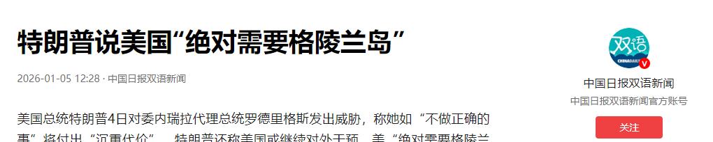 但时代早已变了,单边霸权的老路走不通了 —— 欧洲盟友的集体反对、美国国内的普遍质疑、格陵兰岛的主权坚守,都说明主权平等和互利共赢才是国际社会的普遍共识。美国若执意沿着霸权主义的道路走下去,最终只会在北极圈的寒风中自食苦果。