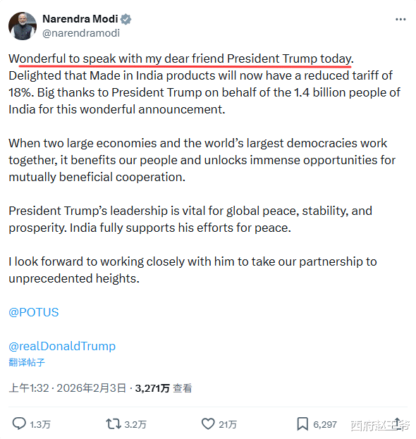 当地时间2月2日,特朗普在社交媒体上高调宣布,他与印度总理莫迪通电话后,双方正式达成一项重磅贸易协议。
