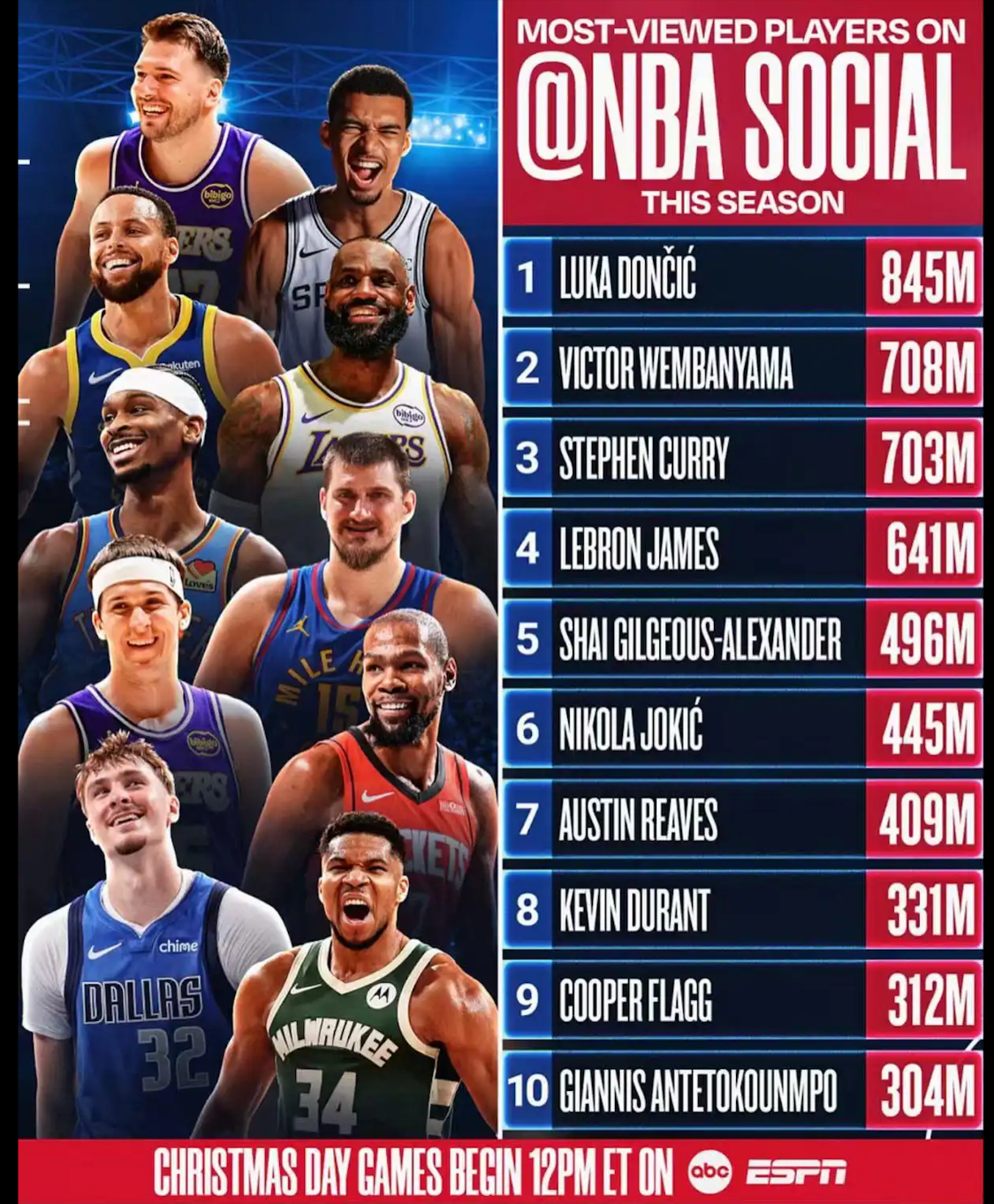 近日,美国媒体统计并公布了本赛季至今NBA球星的社交媒体浏览量数据,从某种角度反映了球员在全球范围内的关注度与影响力。下面,我们就来看看这份榜单的前十名。