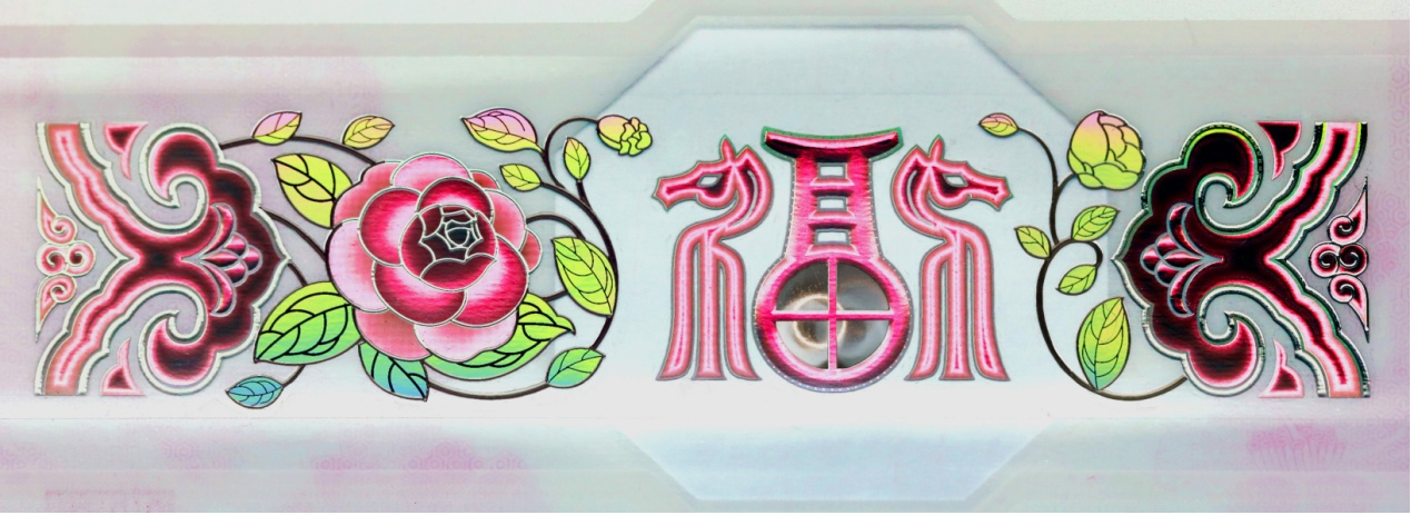 特征:改变观察角度,可见"如意云纹"、"山茶花"与"福"字组成的装饰纹样呈现多色动感效果。"福"字下部"田"字内有立体动感高亮圆环