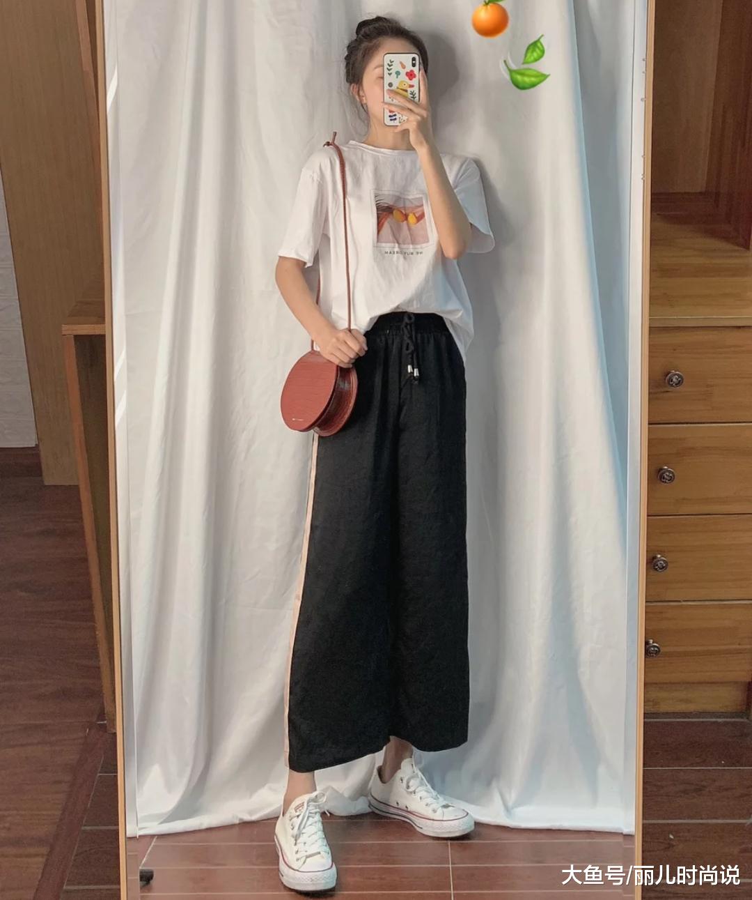 白色短袖t+阔腿裤,休闲舒适又显腿长的穿搭,t恤上面的图案设计我个人就挺喜欢的,下身还选择了这么一条阔腿裤搭配,侧边口袋设计让穿上的人更显年轻,记得上衣要全部塞进裤子里面,这样更显高挑,上班、日常这样穿都相当不错。