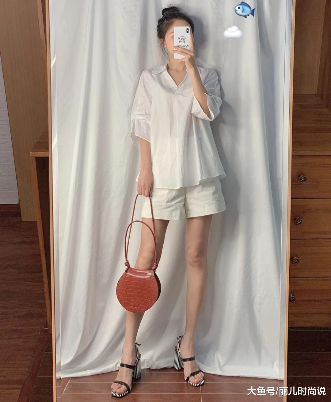 那么干净的一身白色穿搭,和炎热高温的夏季再配不过,整体看起来就给人很清爽干净的feel,白色的衬衫并没有基础经典款式的沉闷单调,这种衬衫的设计更偏向时尚,牛仔短裤+高跟凉鞋搭配,简约又显气质。