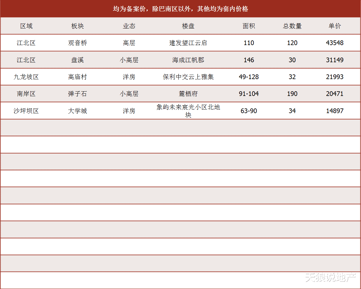 注释:除巴南区以外,其他区域均为套内价格