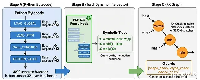 PyTorch 里这个计算图叫 FX Graph,把操作表示成有向无环图(DAG)的节点。调用 torch.compile 时,TorchDynamo 分析 Python 字节码,生成 FX 图:节点是张量操作,边是数据依赖。