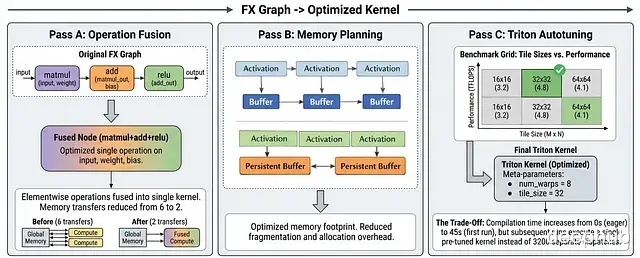 TorchInductor 拿到 FX 图后会做三件事:操作融合、内存规划、Triton 自动调优。