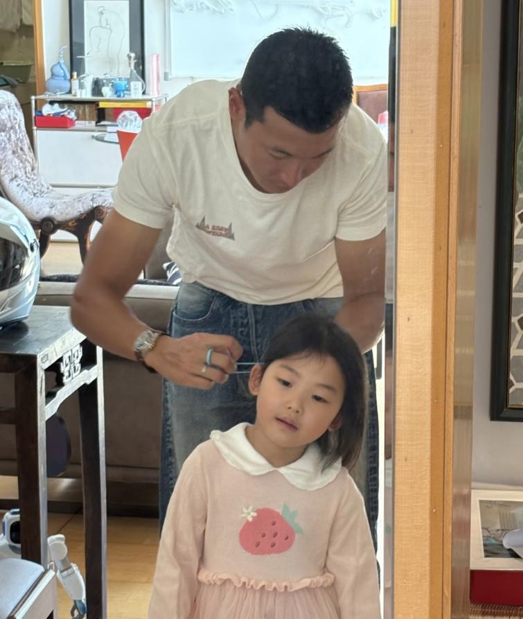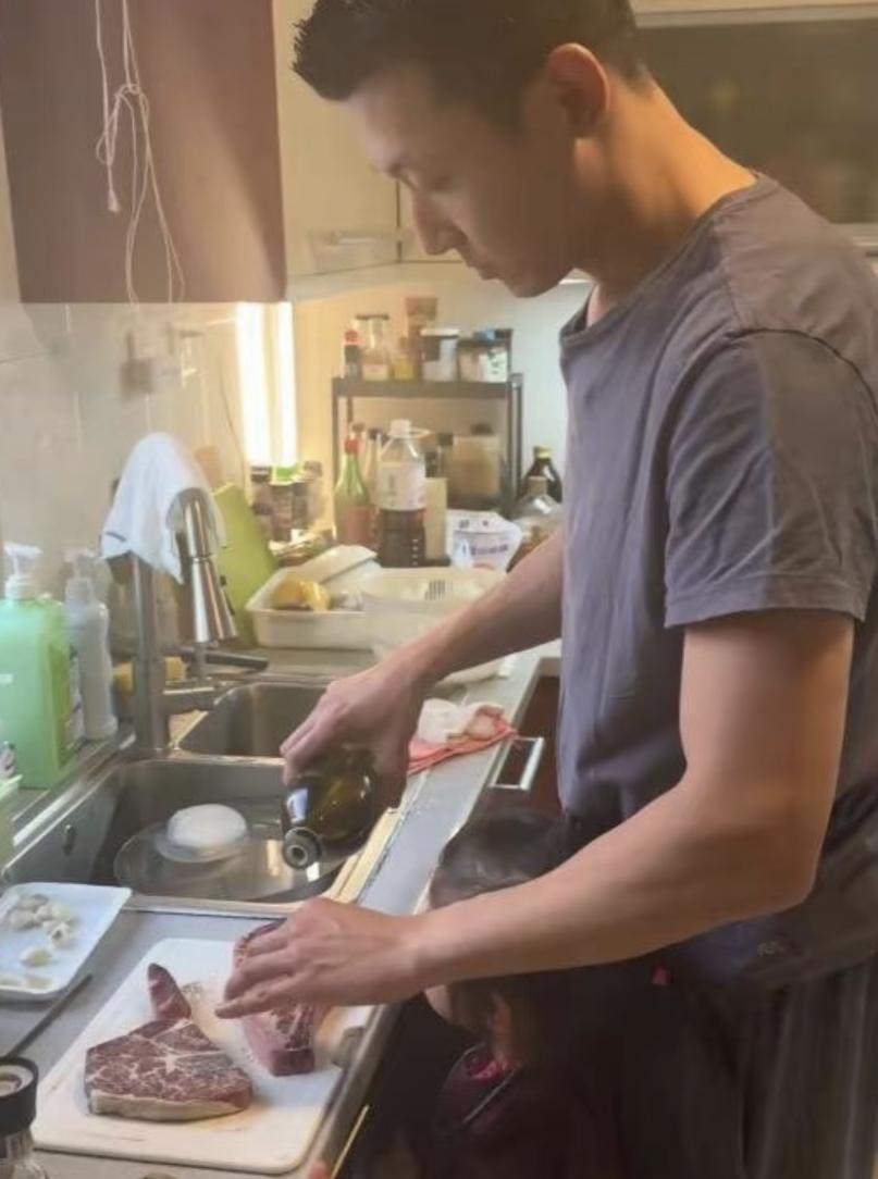在今年初雪的时候,王昀佳在新家的厨房切牛肉举办暖房宴。