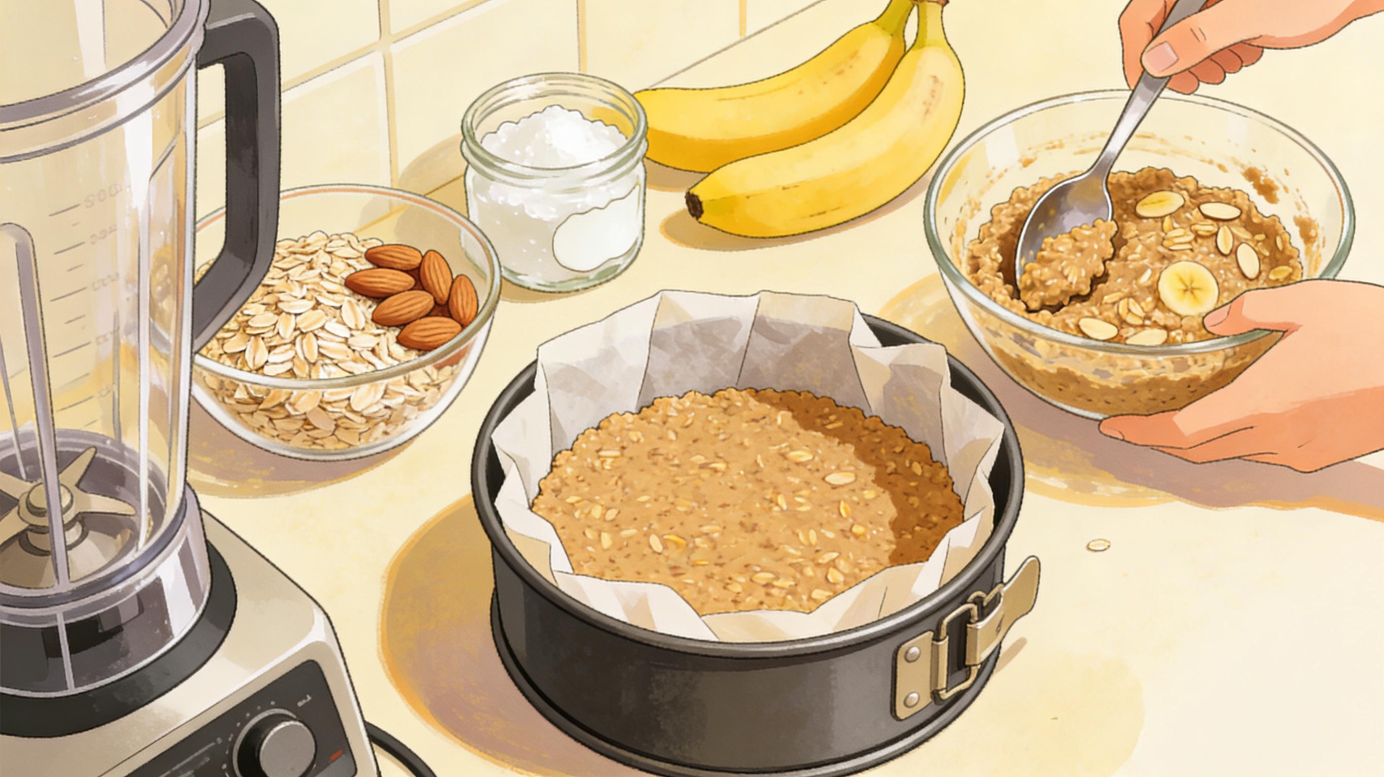 步骤一:制作香脆营养的“地基”,画面中有料理机、燕麦、杏仁、熟香蕉、椰子油和6寸活底蛋糕模,展示将燕麦杏仁打碎后与香蕉泥、椰子油混合并压实入模的场景。