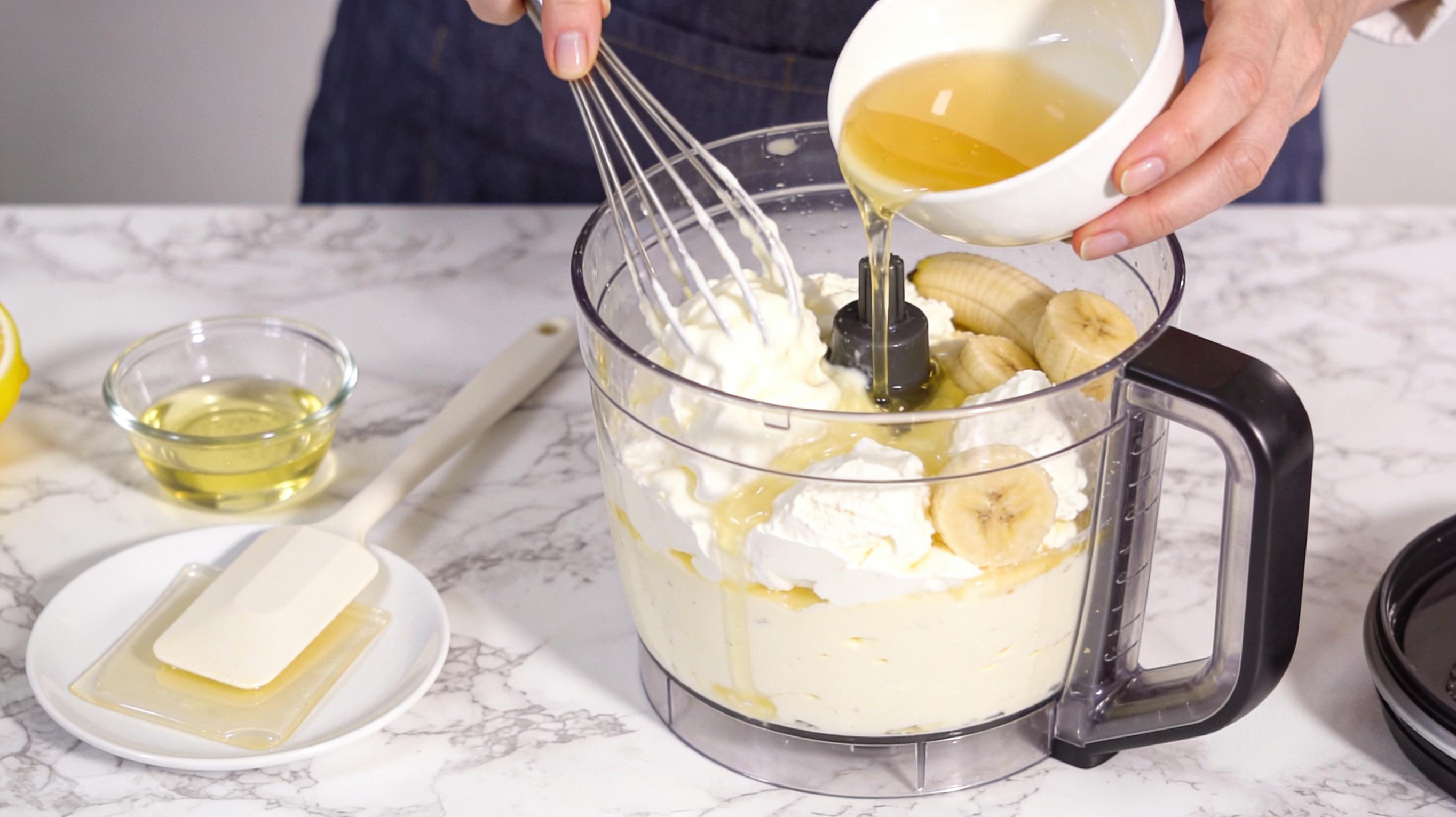 步骤二:创造丝滑轻盈的“芝士云朵”,画面中有料理机、希腊酸奶、奶油奶酪、熟香蕉、柠檬汁、吉利丁片和刮刀,展示将食材搅打顺滑后与融化的吉利丁液混合的场景。