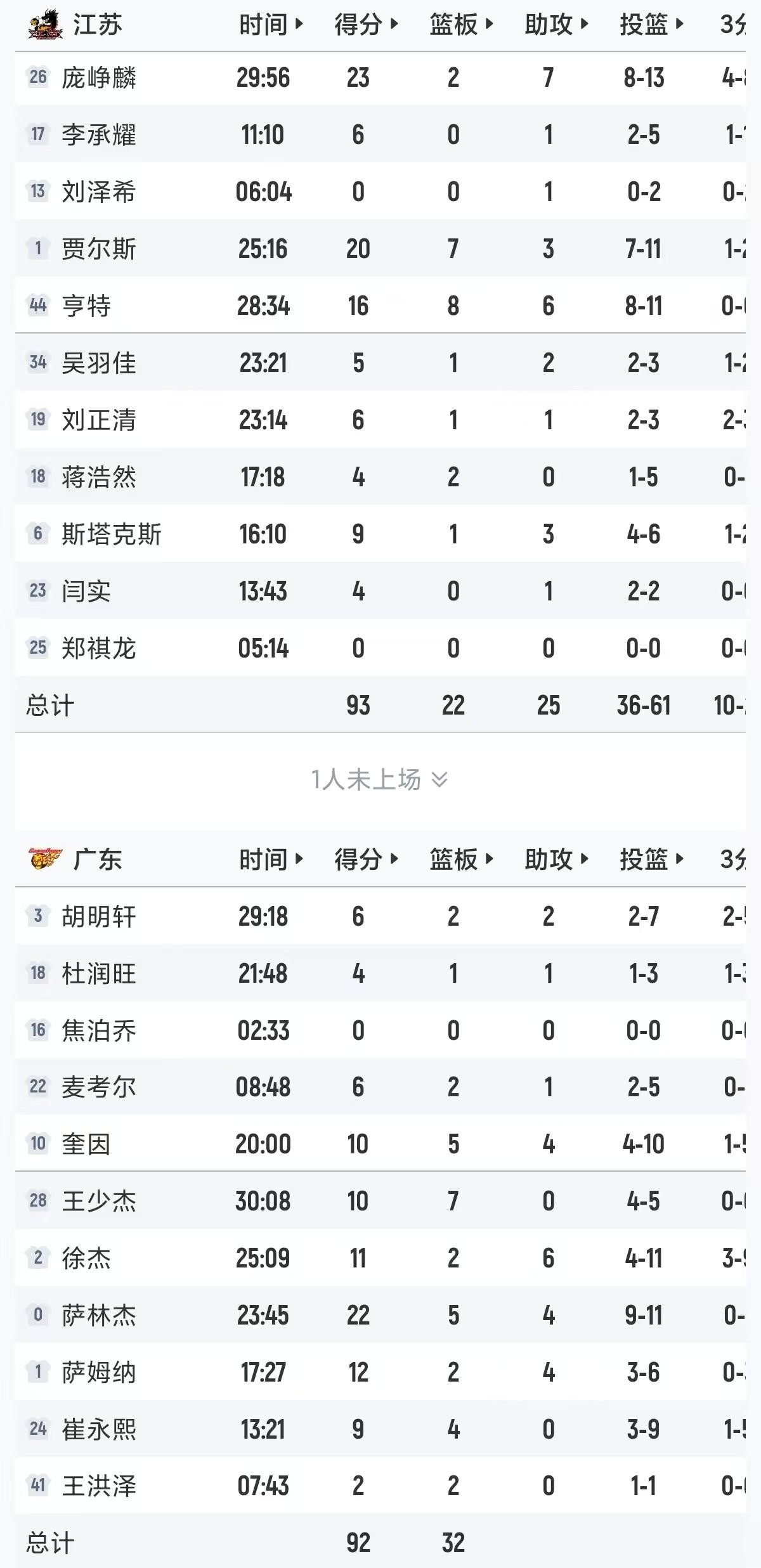 下半场比赛,江苏开局一波16-6打停广东,徐杰带队的效果不太好,比赛继续胡明轩替下徐杰,本节胡明轩外线连续打铁,崔永熙效率也下滑,萨林杰连续冲击禁区砍分,三节战罢广东落后1分。末节决战,双方半节缠斗分差始终在一个球权,但广东慢慢掌控比赛节奏,本节还剩不到三分钟,领先6分的广东打停江苏,胡明轩关键失误让江苏追到还差2分,庞峥麟抛投扳平,比赛还剩34秒,崔永熙篮下吃饼,吴羽佳三分命中,最后2秒徐杰错失绝杀,最终广东92-93不敌江苏。
