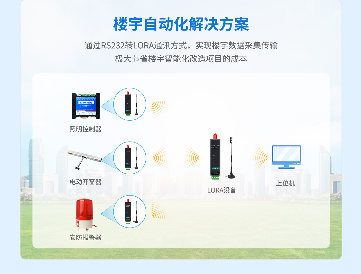 全部通过 LoRa 无线数传终端实现低成本、广覆盖。
