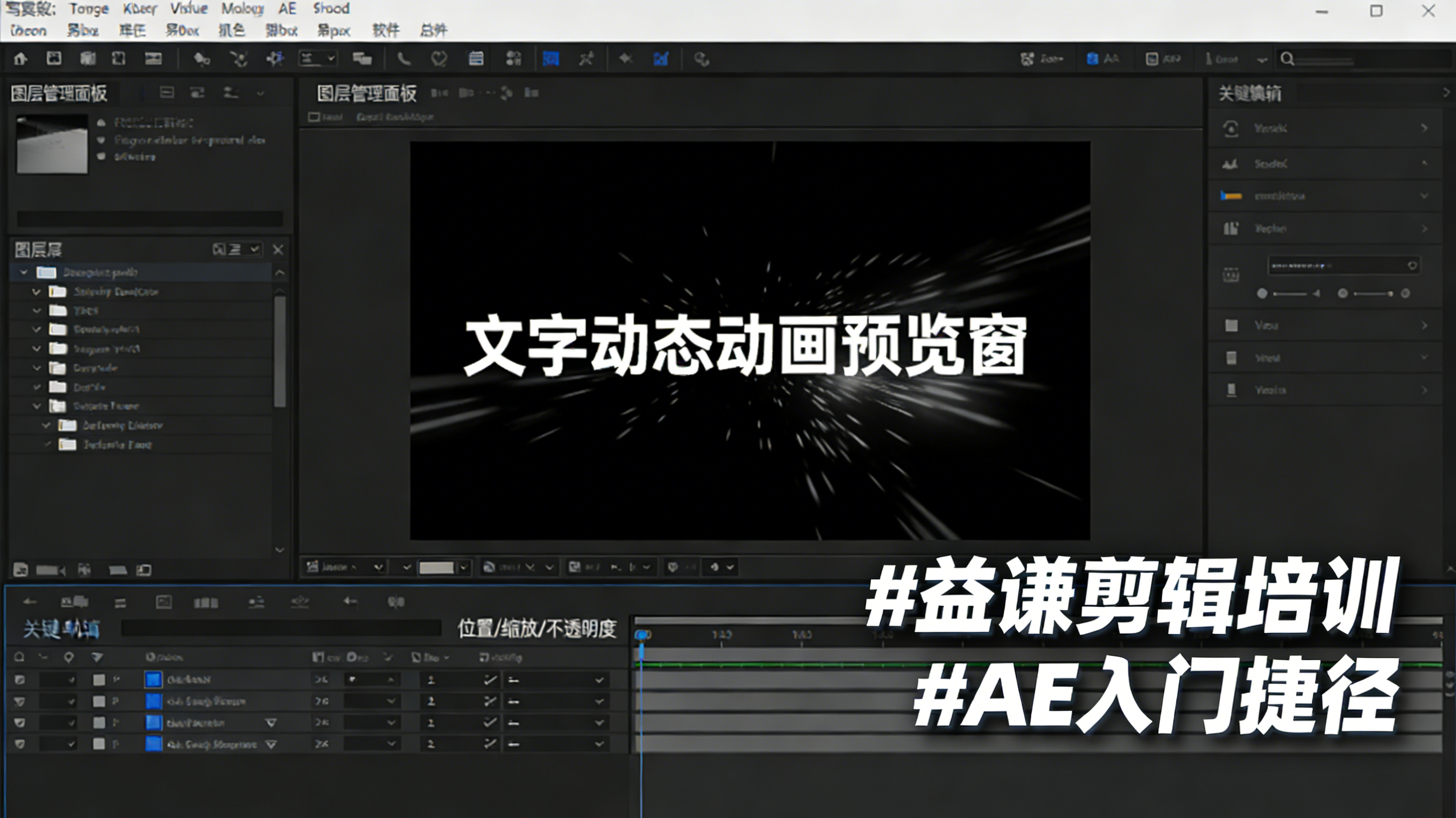 益谦影视后期培训的核心教学思路,是 “抓核心、弃冗余、重实战”,让新手在最短时间内掌握最实用的 AE 特效技能。课程开篇就明确告知新手,AE 的核心是图层、关键帧和合成,这三大模块是所有特效制作的基础,无需在冷门功能上耗费精力。针对这三大核心模块,课程采用 “演示 + 实操 + 纠错” 的模式,让新手快速夯实基础。比如在讲解关键帧时,老师不会只讲 “添加关键帧的步骤”,而是结合 “文字移动动画”“图片缩放效果” 等简单案例,让新手直观理解关键帧的作用的原理,再通过反复实操掌握缓动曲线调整、关键帧复制等实用技巧。