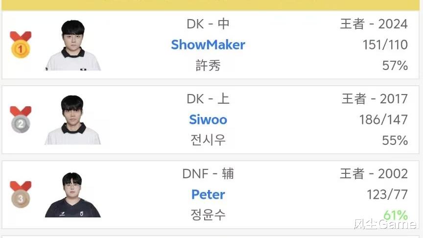 LOL韩服排行榜,最近特别卷,DK中上两兄弟,一直霸占韩服前二,前几天Siwoo登顶,许哥最近又反超了,前五榜单里,除了上中之外,还有DK的打野Lucid,DNS的辅助Peter,以及T1战队的下路Peyz,这五个人的分差很小,第一的许哥现在是2024,第五的Lucid是1951,只差73分。