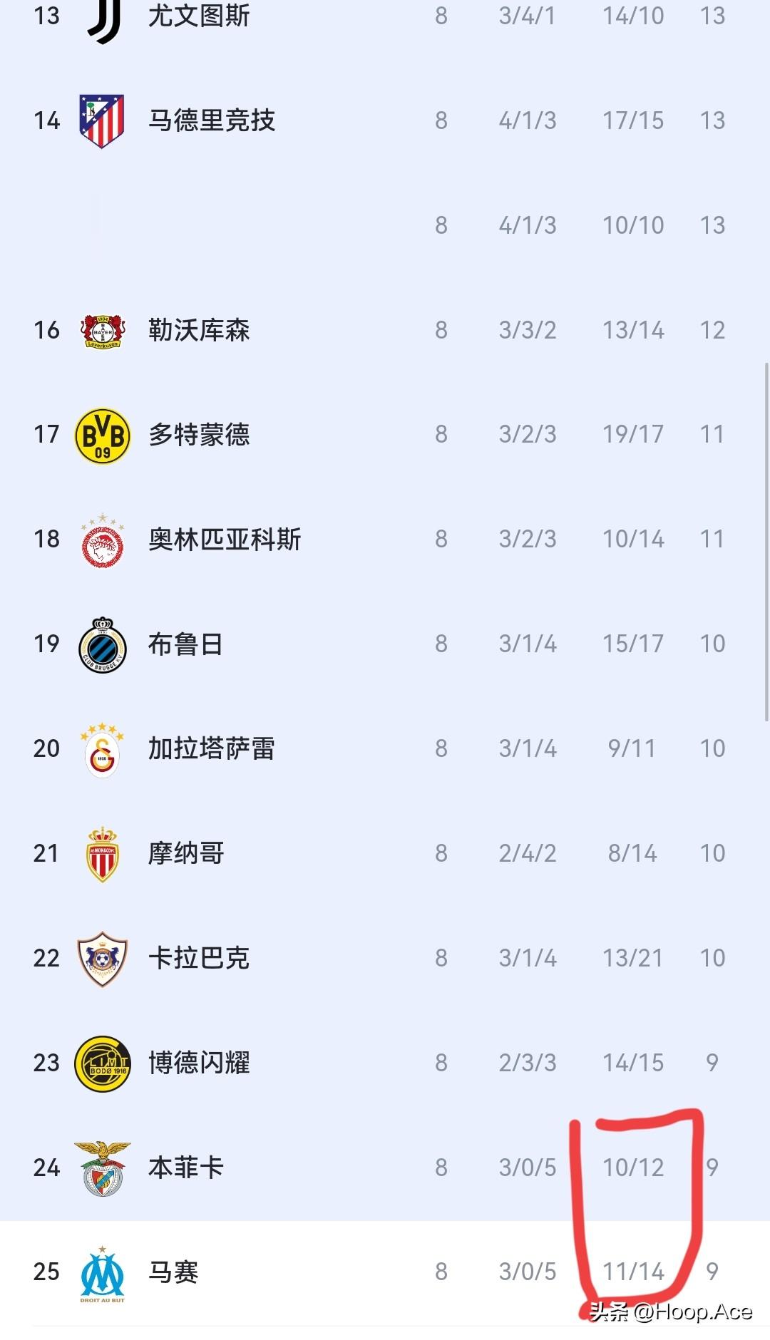 被淘汰的球队中,也不乏五大联赛的劲旅,除了压哨出局的马赛之外,毕尔巴鄂竞技在末轮主场2-3不敌葡萄牙体育,无缘附加赛!那不勒斯主场同样以2-3不敌切尔西,只排在第30名,另外黄潜与法拉克福更是发挥失常,早早就无缘附加赛!