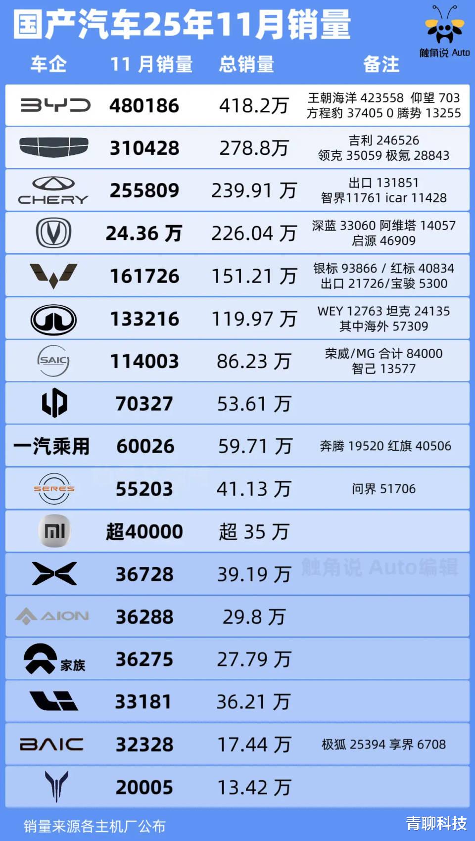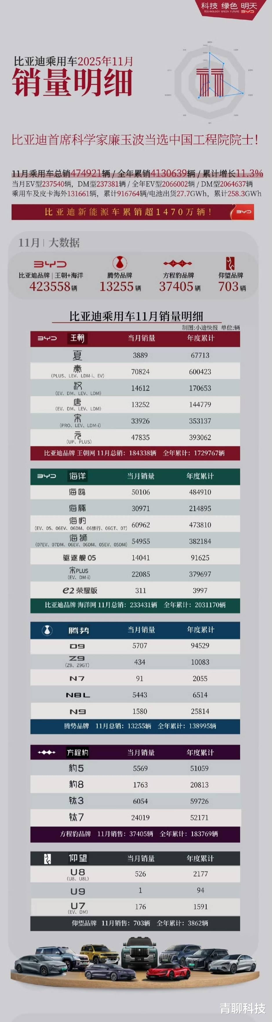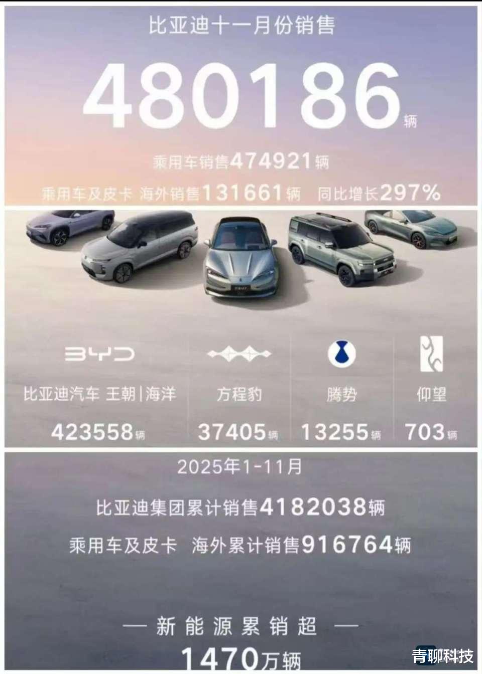单月 48 万辆,其中海外卖了 13 万多辆,同比暴涨 近 3 倍。1-11 月累计 418 万辆,全年目标已完成 91%。而最厚重的那个数字是:全球新能源车累计销量,跨过了 1470 万辆。