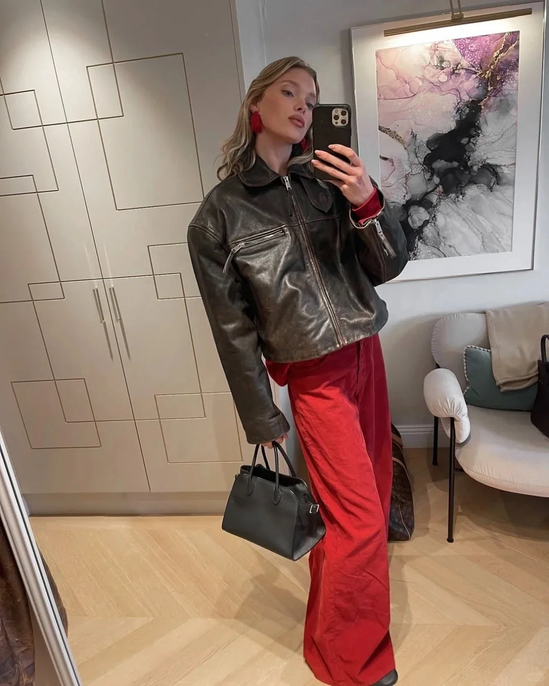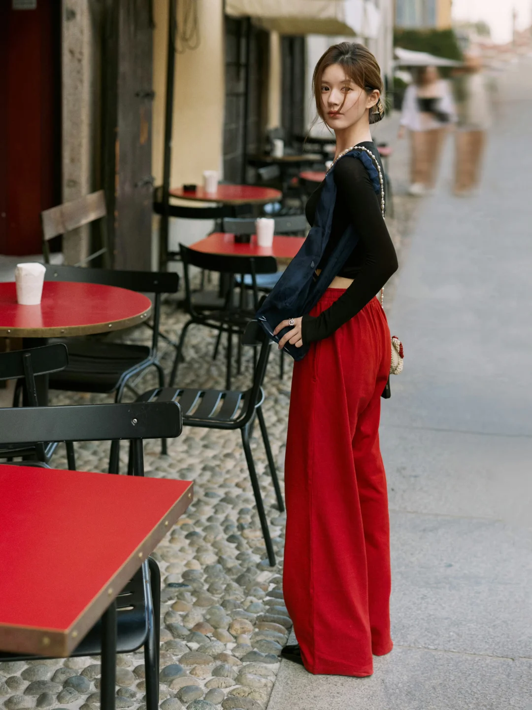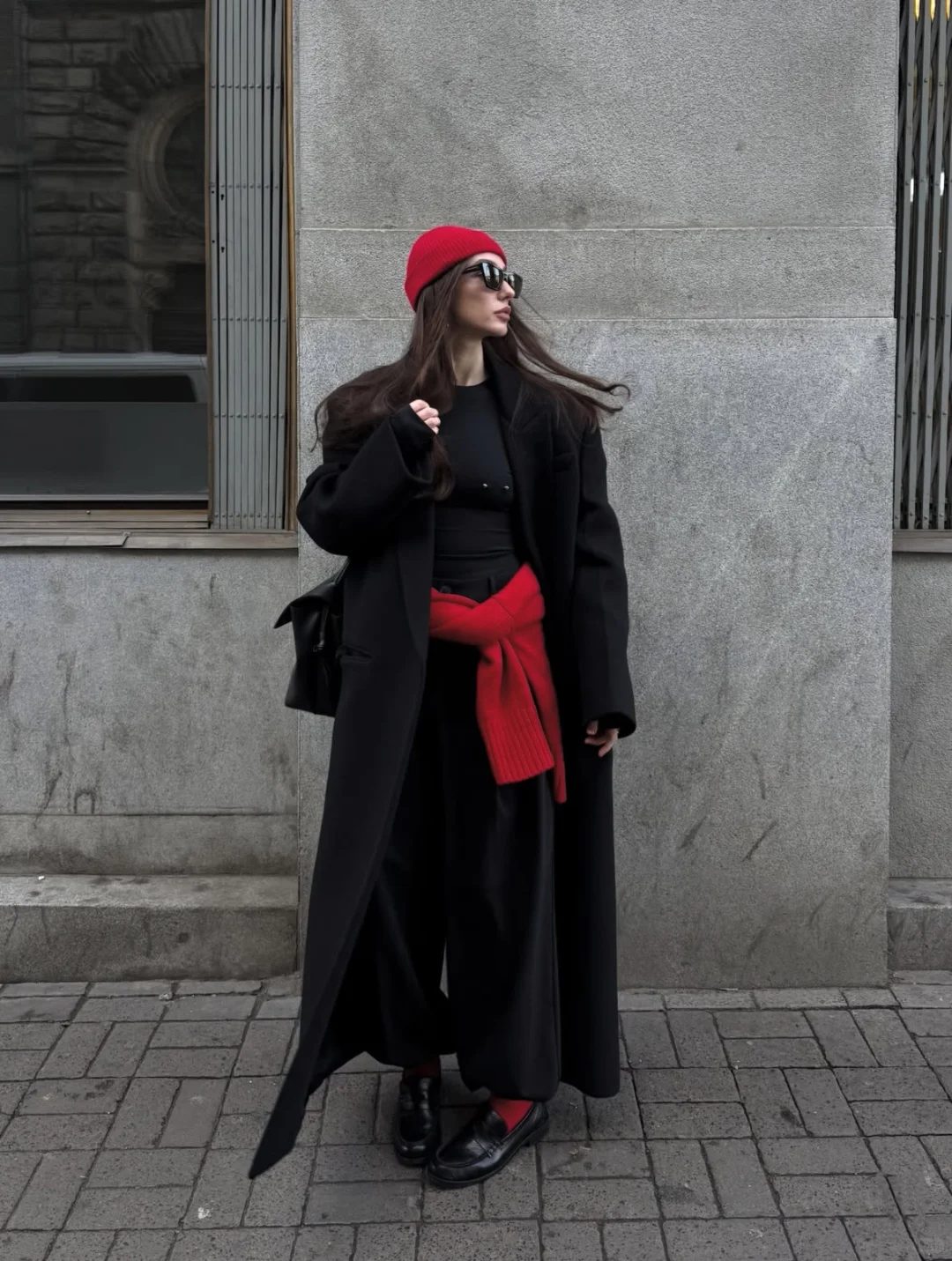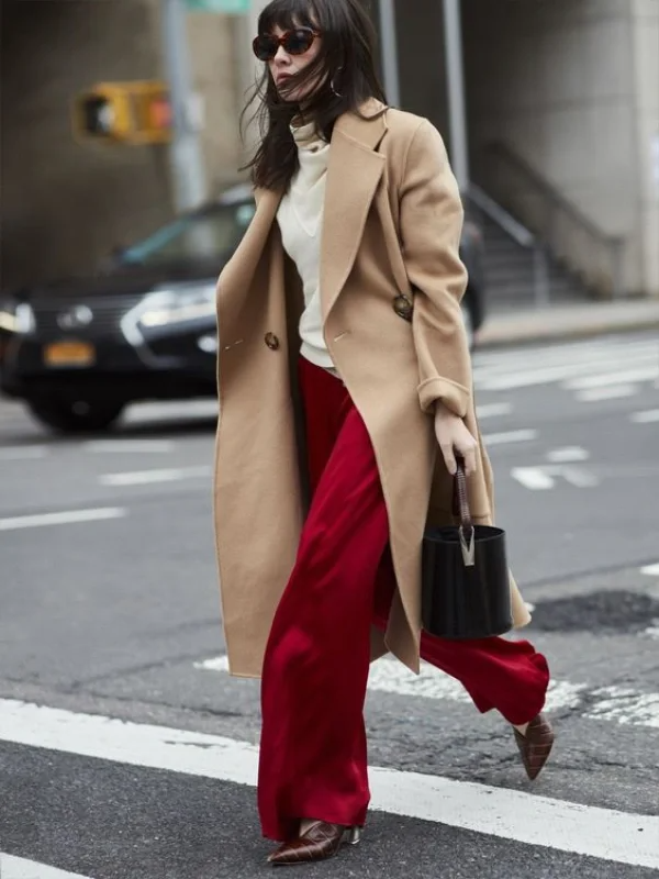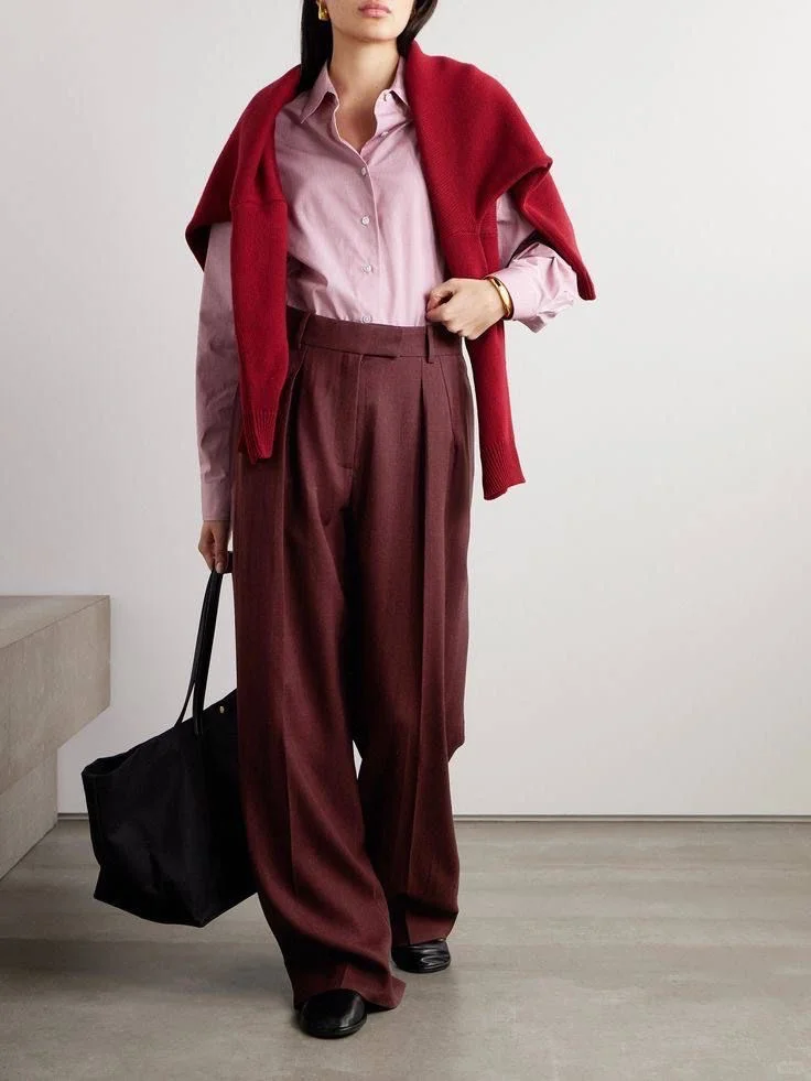 用修身或合身的上衣中和阔腿裤的宽松感,再用中性色(黑、白、驼、燕麦)压稳红色的视觉张力,轻松拿捏复古与利落的平衡。