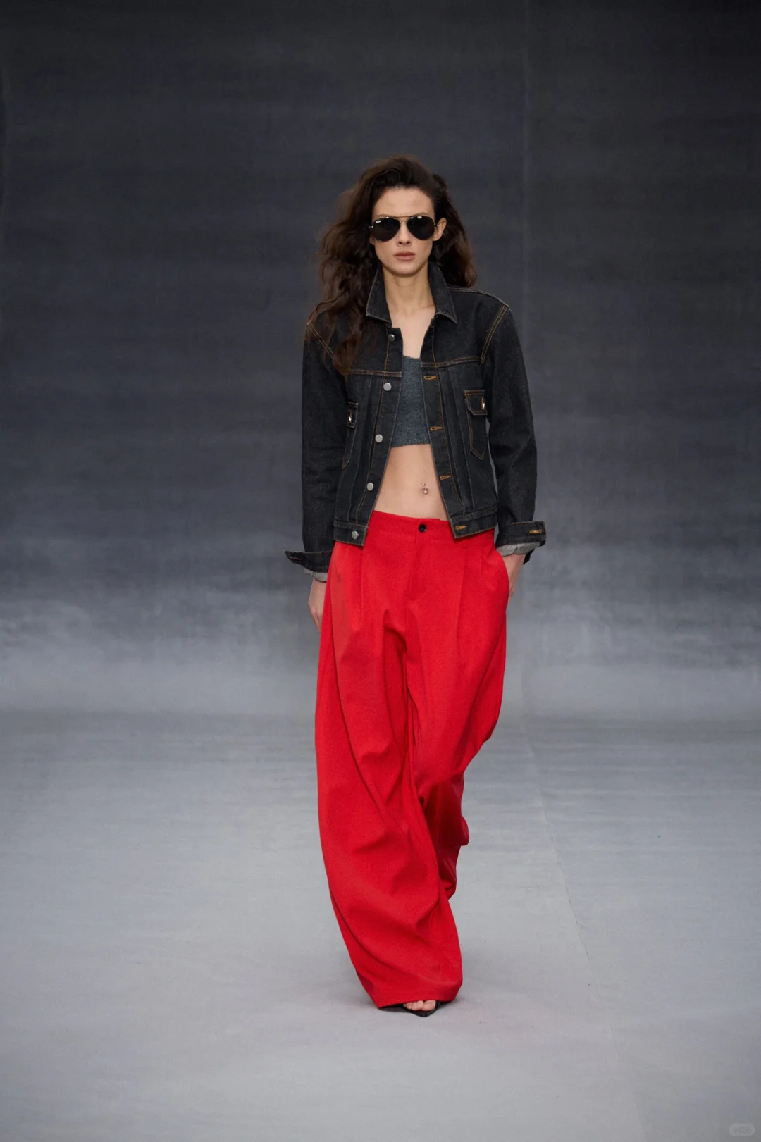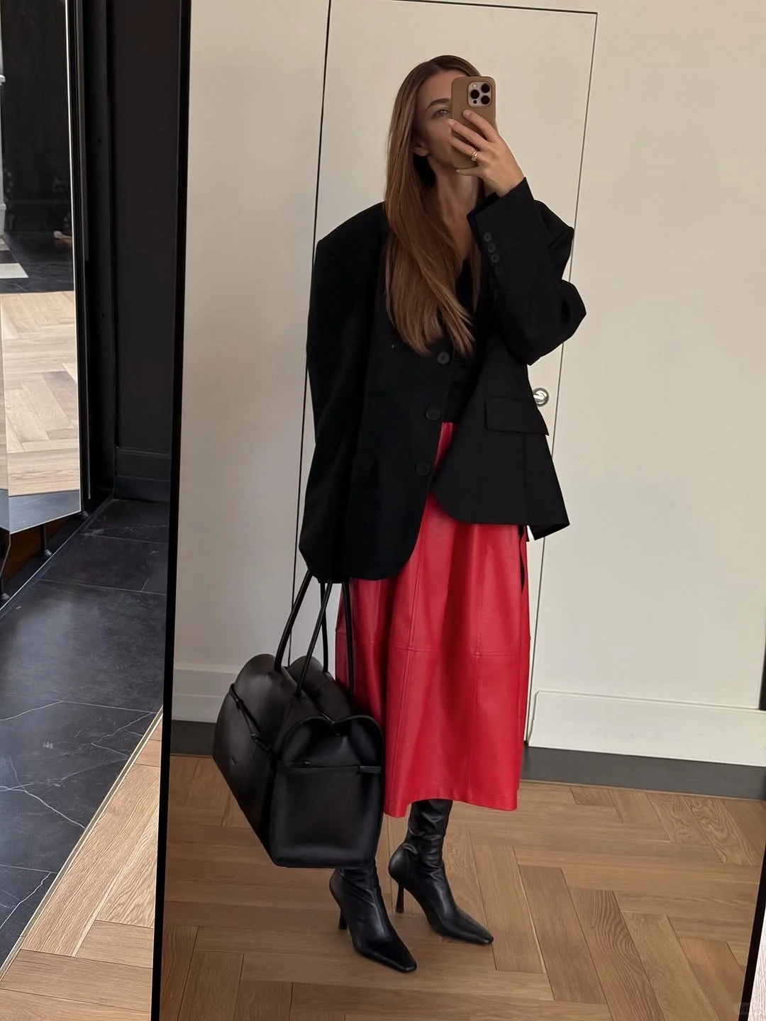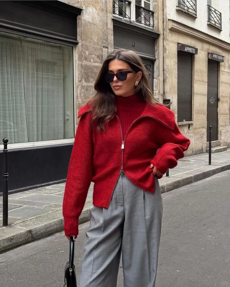 用修身或合身的上衣中和阔腿裤的宽松感,再用中性色(黑、白、驼、燕麦)压稳红色的视觉张力,轻松拿捏复古与利落的平衡。